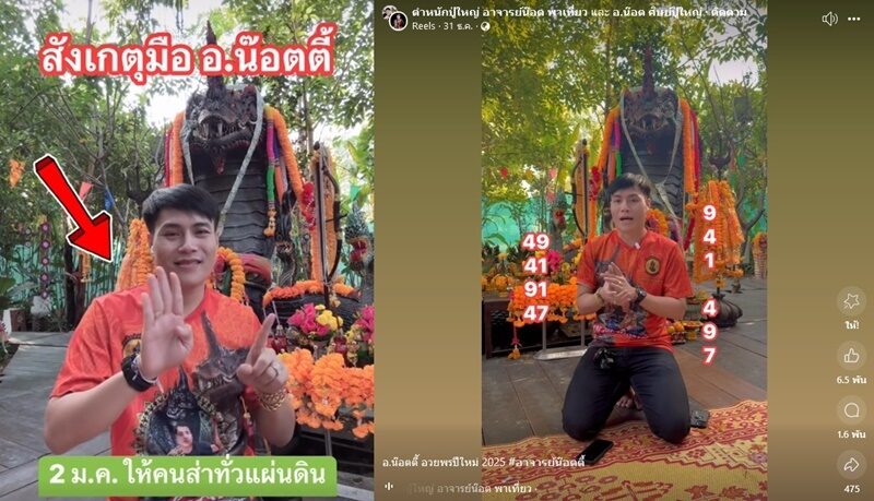 -เลข อ.น๊อตตี้ 49 , 41 , 91 , 47 เม็ดเดียว 49-94 ส่วน 3 ตัวมี 941 กับ 497 เน้น 941 เลขที่ฝันเห็นและยังตรงปิงปองไข่พญานาคด้วย