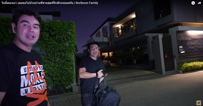 ตั๊ก บริบูรณ์ เผยคลิป วันนี้ผมเหงา เลยขอไปป่วนบ้านพี่ชายสุดที่รักสักหน่อยครับ ทางช่อง Boriboon Family ตั๊ก บอกแล้วว่าบุกไปเลยไม่ต้องขอ ยามค่ำคืนไปถึงบ้านจ๊อบ นิธิ นักแสดงรุ่นพี่คนสนิท โดยบอกด้วยว่า เขาเป็นคนแรกๆที่พาผมเที่ยว บ้านหลังใหญ่จน ตั๊ก ตะลึง แค่ประตูก็สั่งตรงมาจากอินเดียแล้ว เพราะเป็นคนชอบของเก่า เข้าไปในบ้าน ตั๊ก อุทานอีกบ้านใหญ่มาก พื้นที่ประมาณ 1 ไร่