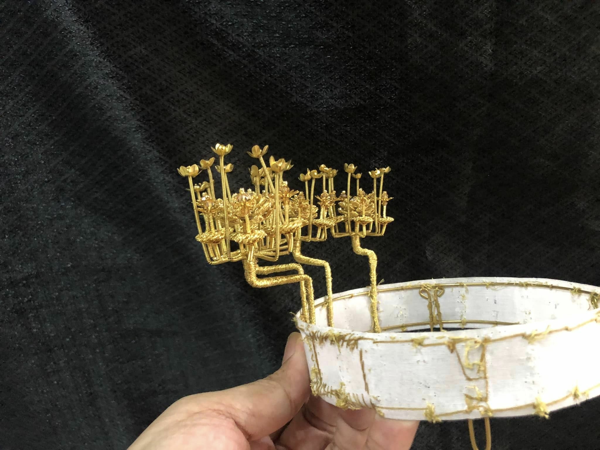 นอกจากความสวยของเจ้าสาว และเครื่องประดับแล้วนั้น หลายคนยังโฟกัสที่เครื่องหัว หรือเครื่องประดับศีรษะ ที่เรียกว่า ‘ฮัวก๋วน’ มงกุฎดอกไม้ไหวทองคำ ที่สั่งทำพิเศษขึ้นมาใหม่เพื่อการนี้โดยเฉพาะ ซึ่งก่อนหน้านี้ เพจ ปิยณัฏฐ์ จุ๊บ อิสสระสงคราม ได้โพสต์รูปและข้อความถึงรายละเอียดของการประดิษฐ์ฮัวก๋วนไว้ว่า