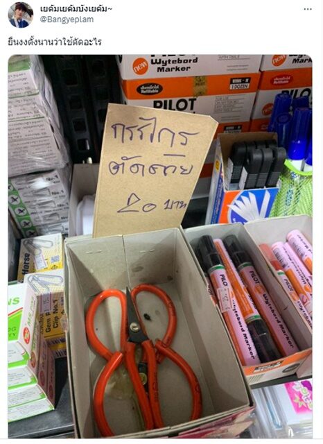 เรียกได้ว่าเป็นภาพที่วัดใจคนอ่านสุด ๆ หลังมีผู้ใช้ทวิตเตอร์ @Bangyeplam โพสต์ภาพป้ายราคากรรไกรในร้านเครื่องเขียนแห่งหนึ่ง โดยระบุแคปชั่นว่า ‘ยืนงงตั้งนานว่าใช้ตัดอะไร’