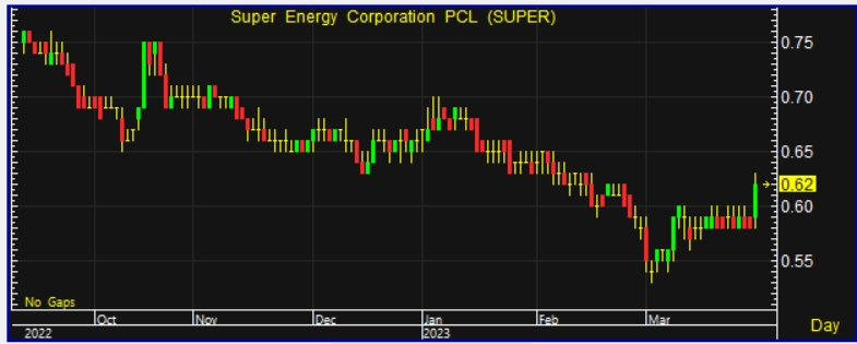 ผู้สื่อข่าวรายงานว่า วันนี้ (30 มี.ค.66) ราคาหุ้นบริษัท ซุปเปอร์ เอนเนอร์ยี คอร์เปอเรชั่น จำกัด (มหาชน) หรือ SUPER ปิดภาคเช้าอยู่ที่ระดับ 0.62 บาท บวก 0.04 บาท หรือ 6.90% สูงสุดที่ระดับ 0.63 บาท ต่ำสุดที่ระดับ 0.58 บาท ด้วยมูลค่าซื้อขาย 60.72 ล้านบาท