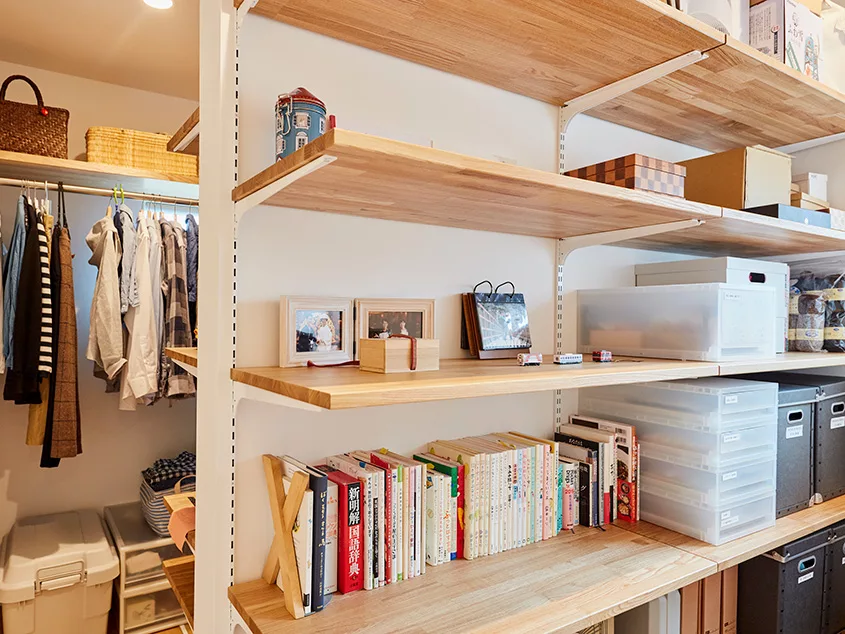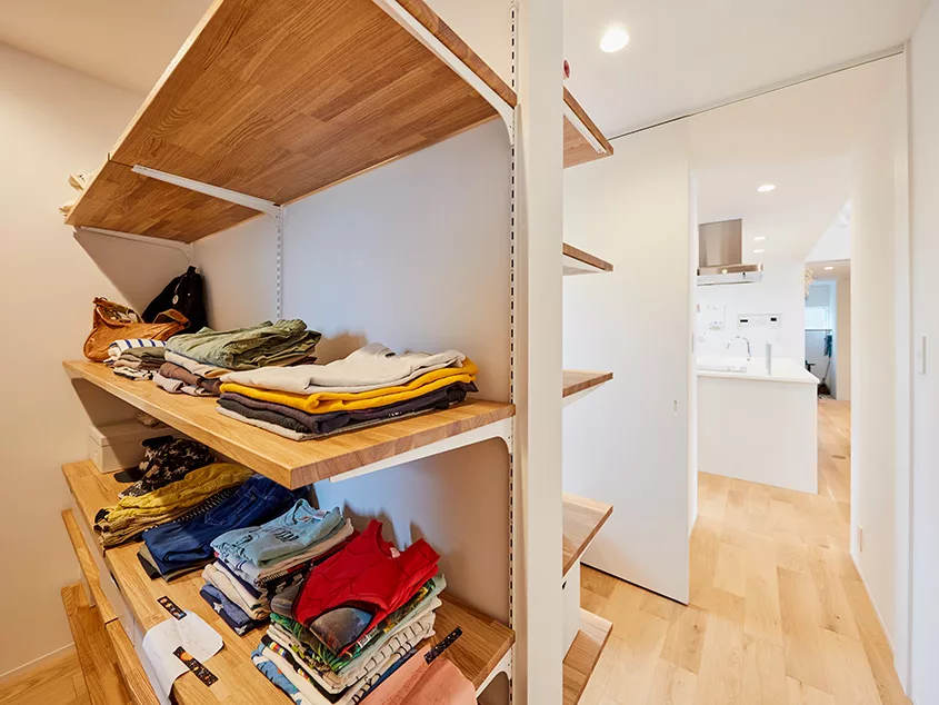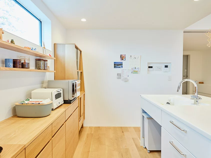 ภายในบ้านตกแต่งด้วยโทนสีน้ำตาลอ่อนๆ สไตล์มินิมอล ช่วยให้บรรยากาศดูปลอดโปร่ง โดยเฟอร์นิเจอร์ที่เลือกใช้ส่วนใหญ่จะเป็นไม้ ออกแนวญี่ปุ่น ส่วนห้องโถงจะไม่ใช้ผนังกั้นห้อง เพื่อให้ห้องดูกว้างขวาง ซึ่งจะเน้นใช้สิ่งของเป็นการกั้นพื้นที่ต่างๆ แทน และจัดวางชั้นวางของ หรือตู้เก็บของได้อย่างลงตัว และจุดเด่นของบ้านหลังนี้ คือการทำห้องครัวอยู่ศูนย์กลางของบ้าน เพื่อสะดวกสบายต่อการใช้งาน จัดได้ว่าเป็นบ้านที่ให้ความรู้สึกอบอุ่น และสามารถใช้เวลากับครอบครัวได้อย่างเต็มที่
