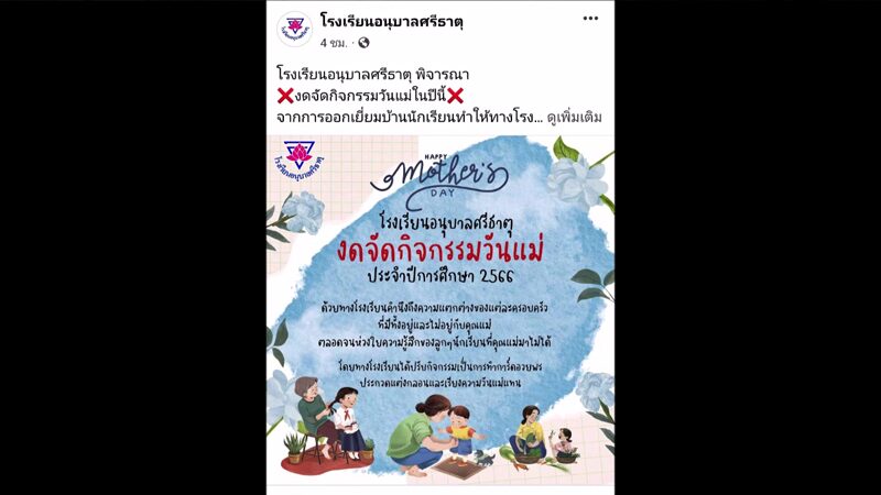 วันที่ 10 ส.ค.2566 ผู้สื่อข่าวรายงานว่า ในเพจเฟซบุ๊ก โรงเรียนอนุบาลศรีธาตุ ได้โพสต์รูปภาพและข้อความว่า “โรงเรียนอนุบาลศรีธาตุ พิจารณา งดจัดกิจกรรมวันแม่ในปีนี้ จากการออกเยี่ยมบ้านนักเรียนทำให้ทางโรงเรียนมีข้อมูลนักเรียนที่อยู่กับแม่ประมาณ 30% ทางโรงเรียนได้คำนึงถึงความแตกต่างของแต่ละครอบครัวที่อยู่กับคุณแม่และไม่ได้อยู่ ตลอดจนห่วงใยความรู้สึกของลูกๆนักเรียนที่คุณแม่มาร่วมกิจกรรมไม่ได้