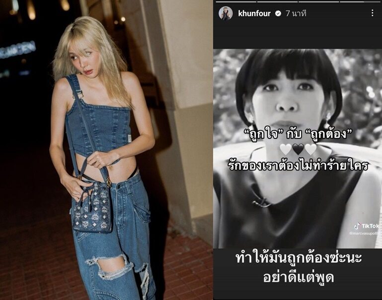 ขณะที่เพจดังเจ๊มอย 108 ก็ได้โพสต์ภาพจากไอจีสตอรี่ของสาวโฟร์ ที่มีข้อความว่า “ถูกใจ กับ ถูกต้อง รักของเราต้องไม่ทำร้ายใคร และบอกว่า ทำให้มันถูกต้องนะ อย่าดีแต่พูด” พร้อมแคปชั่นว่า… “จะเล่ายังไงดีนะ..โรคหัวใจกำเริบเลิฟ ละละเลิฟๆๆๆ อิแฟนคลับบางคนก็โยงกันเก่งงงงงงง วู้ววววว”