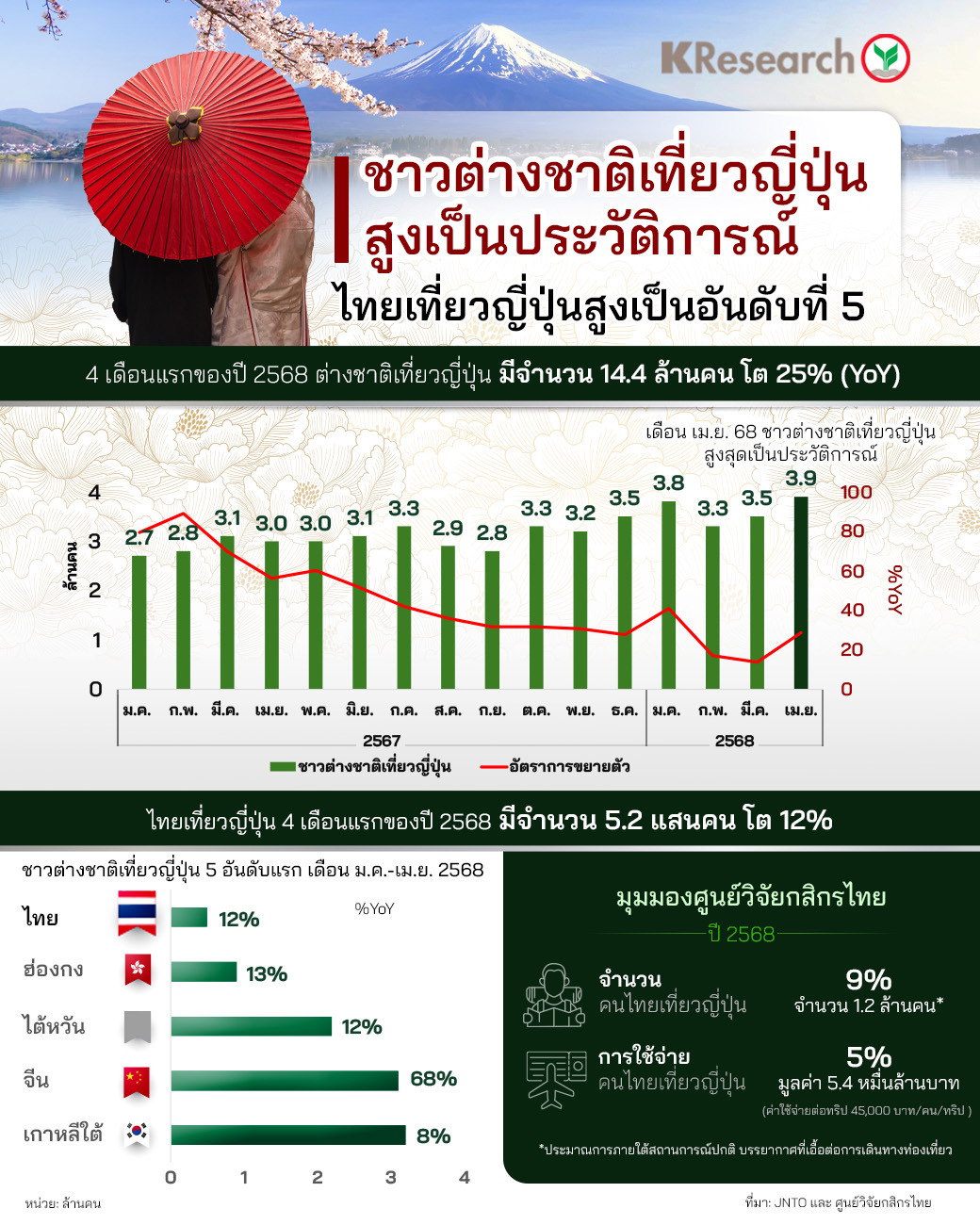 ศูนย์วิจัยกสิกรไทย รายงาน สถานการณ์ท่องเที่ยวญี่ปุ่น ช่วง 4 เดือนแรก (ม.ค. - เม.ย.) ปี 2568 พบว่า มีนักท่องเที่ยวต่างชาติมาเยือนกว่า 14.4 ล้านคน เติบโต 25% เมื่อเทียบกับปีก่อน (YoY)