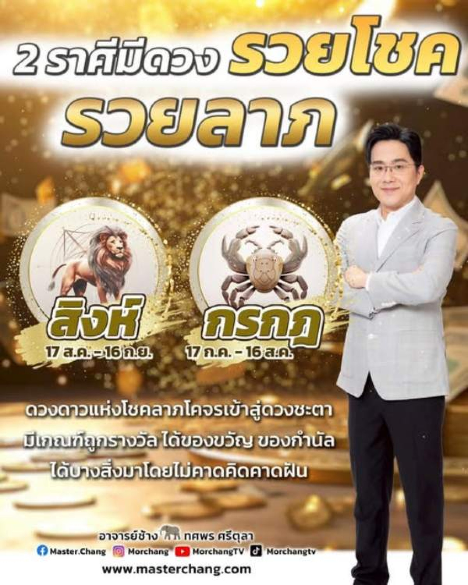 2 ราศี มีดวงรวยโชครวยลาภ ได้แก่ ราศีสิงห์ และ ราศีกรกฎ ดวงดาวแห่งโชคลาภโคจรเข้าสู่ดวงชะตา มีเกณฑ์ถูกรางวัล ได้ของขวัญ ของกำนัล ได้บางสิ่งมาโดยไม่คาดคิดคาดฝัน