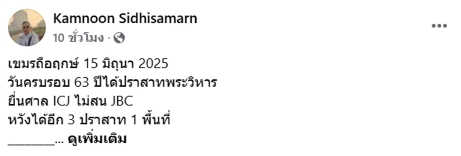 เมื่อวันที่ 14 มิถุนายน 68 นายคำนูณ สิทธิสมาน อดีตสมาชิกวุฒิสภา(สว.) โพสต์เฟซบุ๊กส่วนตัวระบุข้อความว่า
