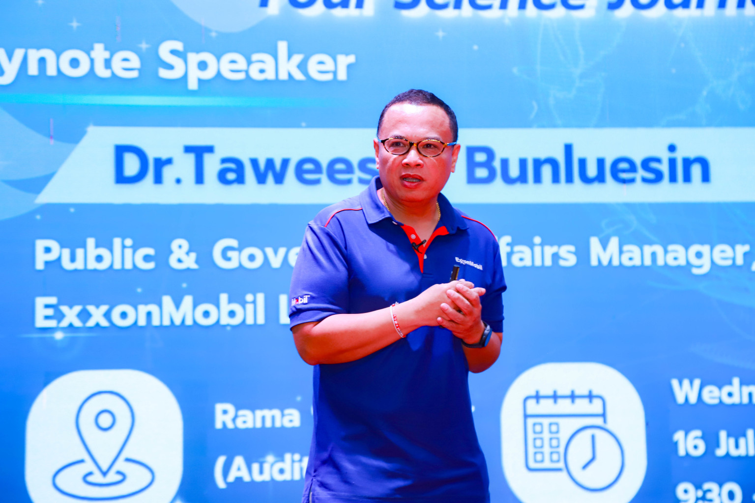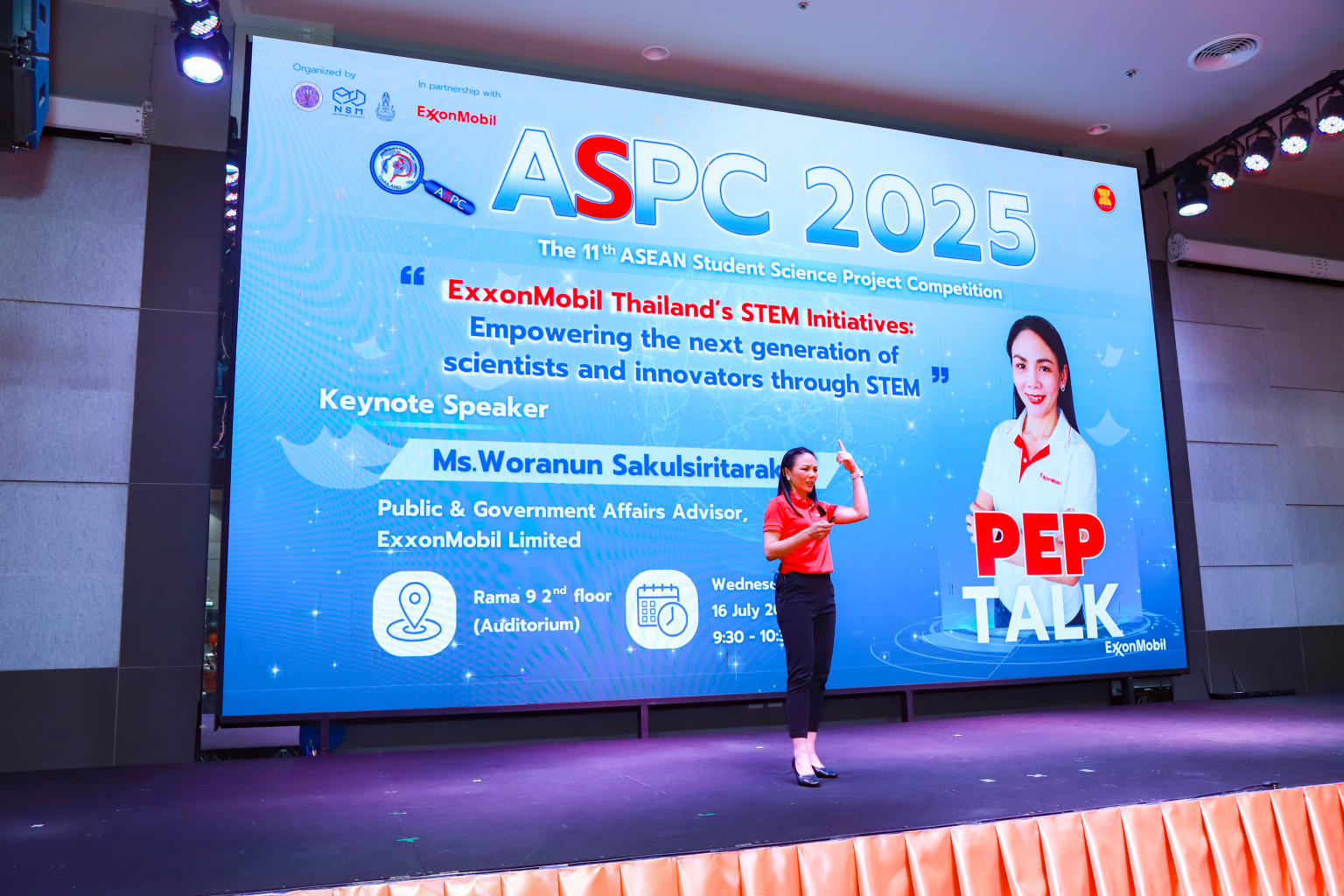 รอง ผอ. NSM กล่าวต่อว่า นอกจากนี้ เยาวชนอาเซียนจะได้มีโอกาสร่วมฟังกิจกรรม PEP TALK โดยมี ดร.ทวีศักดิ์ บรรลือสินธุ์ ผู้จัดการฝ่ายกิจกรรมองค์กรและรัฐกิจสัมพันธ์ บริษัท เอ็กซอนโมบิล จำกัด มาเป็นวิทยากรถ่ายทอดประสบการณ์และแรงบันดาลใจในการทำงานในเส้นทางสายวิทยาศาสตร์ ในหัวข้อ “From Passion to Project: Fueling Curiosity into Discovery Your Science Journey Starts Here” และคุณวรณันสกุลศิริธรากุล ที่ปรึกษาฝ่ายกิจกรรมองค์กรและรัฐกิจสัมพันธ์ บริษัท เอ็กซอนโมบิล จำกัด บรรยายในหัวข้อ “ExxonMobil Thailand's STEM Initiatives: Empowering the next generation of scientists and innovators through STEM”