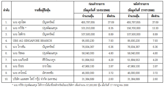 ทั้งนี้ ภายหลังทำรายการ บริษัทมีการแจ้งการเปลี่ยนแปลงโครงสร้างการถือหุ้นของบริษัทฯ ผ่านตลาดหลักทรัพย์ฯอ้างอิงตามข่าวที่เผยแพร่ต่อตลาดหลักทรัพย์แห่งประเทศไทย เมื่อวันที่ 17 กรกฎาคม 2568 ในหัวข้อ ข่าว ก.ล.ต. สรุปแบบรายงาน 246-2 ลงวันที่ 16 กรกฎาคม 2568 และแจ้งการเปลี่ยนแปลงโครงสร้างการถือหุ้นของบริษัทฯ นั้น