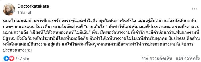 “หมอไม่เคยต่อต้านการปักตะกร้า เพราะรู้และเข้าใจดีว่าธุรกิจมันดำเนินยังไง แต่แค่รู้สึกว่าการต้องบังคับกดดัน ยอดขาย=คะแนน ในเวทีนางงามในสัดส่วนที่ "มากเกินไป" มันทำให้เสน่ห์ของเวทีประกวดลดลง รวมถึงอาจจะหมายความถึง "เสียงที่ไร้ตัวตนของคนที่ไม่มีเงิน" ที่จะซัพพอร์ตนางงามที่เค้ารัก จะมีค่าน้อยกว่าแฟนนางงามที่มีฐานะ ซึ่งขัดกับหลักประชาธิปไตยที่หมอยึดถือ มันทำให้เวทีนางงามไม่ใช่เวทีสำหรับทุกคน Business คือส่วนหนึ่งในคุณสมบัตินางงามอยู่แล้ว แต่ไม่ใช่ส่วนที่ใหญ่จนกลบส่วนอื่นๆจนทำให้การประกวดนางงามไม่ใช่การประกวดนางงาม”