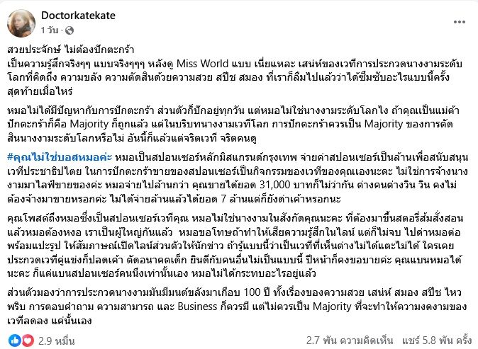 #คุณไม่ใช่บอสหมอค่ะ หมอเป็นสปอนเซอร์หลักมิสแกรนด์กรุงเทพ จ่ายค่าสปอนเซอร์เป็นล้านเพื่อสนับสนุนเวทีประชาธิปไตย ในการปักตะกร้าขายของสปอนเซอร์เป็นกิจกรรมของเวทีของคุณเองนะคะ ไม่ใช่การจ้างนางงามมาไลฟ์ขายของค่ะ หมอจ่ายไปล้านกว่า คุณขายได้ยอด 31,000 บาทก็ไม่ว่ากัน ต่างคนต่างวิน วิน คงไม่ต้องจ้างมาขายหรอกค่ะ ไม่ได้จ่ายล้านแล้วได้ยอด 7 ล้านแต่ก็ยังด่าเค้าหรอกนะ”