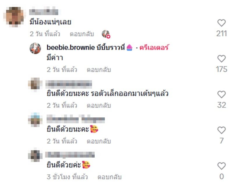 “มีน้องแน่ ๆ เลย” ซึ่งสาวบีบี้ ก็ได้เข้ามาตอบกลับทันทีว่า“มีค่าา” ทำเอาหลายๆคนเข้าไปแสดงความยินดี อาทิ มีน้องแล้วยินดีด้วยค่ะ , ติดตามมาตั้งนาน ในที่สุดก็มีเบบี๋แย้ว ยินดีด้วยค้าบพี่บี , ยินดีด้วยนะคะ รอตัวเล็กออกมาเต้นๆแล้ว เป็นต้น