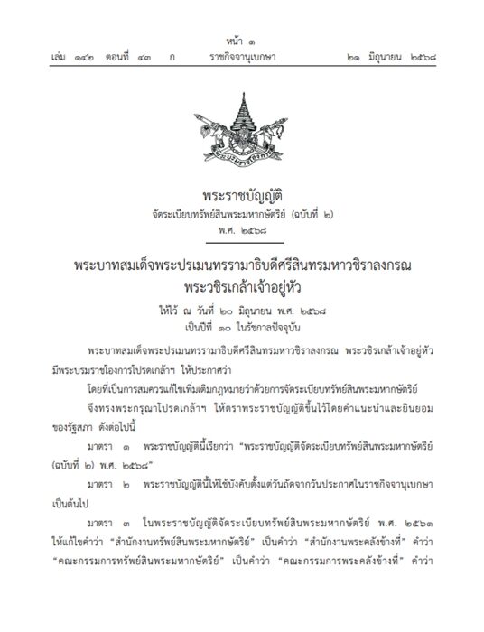 วันที่ 24 มิ.ย.2568 ผู้สื่อข่าวรายงานว่า เว็บไซต์ ราชกิจจานุเบกษา เผยแพร่ พระราชบัญญัติจัดระเบียบทรัพย์สินพระมหากษัตริย์ (ฉบับที่ 2) พ.ศ. 2568 โดยมี น.ส.แพทองธาร ชินวัตร นายกรัฐมนตรี เป็นผู้รับสนองพระบรมราชโองการ