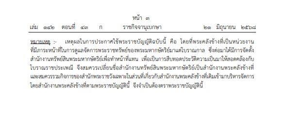 โปรดเกล้าฯ พ.ร.บ.จัดระเบียบทรัพย์สินพระมหากษัตริย์ (ฉบับที่ 2) พ.ศ. 2568 เปลี่ยนชื่อ สำนักงานทรัพย์สินพระมหากษัตริย์ เป็น "สำนักงานพระคลังข้างที่"