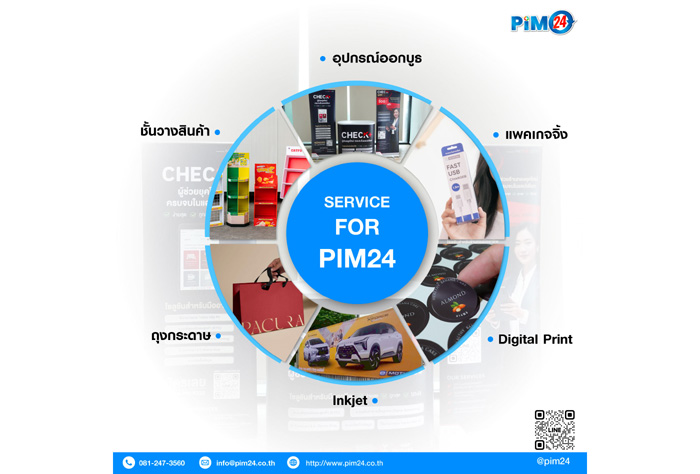 ขณะเดียวกัน PIM 24 เป็นโรงพิมพ์อุปกรณ์ออกบูธครบวงจรที่มีบริการ Customize Instore Media สำหรับแบรนด์พร้อมจัดทำ In-store Media ที่ออกแบบเฉพาะ (Customize) ให้สอดคล้องกับเอกลักษณ์ของแต่ละแบรนด์ เพื่อสร้างประสบการณ์ที่จดจำได้จริงในทุก Touchpoint และสื่อสารภาพลักษณ์แบรนด์ได้อย่างชัดเจนโดย In-store Media มีเพื่อดึงดูดความสนใจลูกค้ากระตุ้นยอดขายและเสริมภาพลักษณ์แบรนด์ที่นิยมประกอยไปด้วย