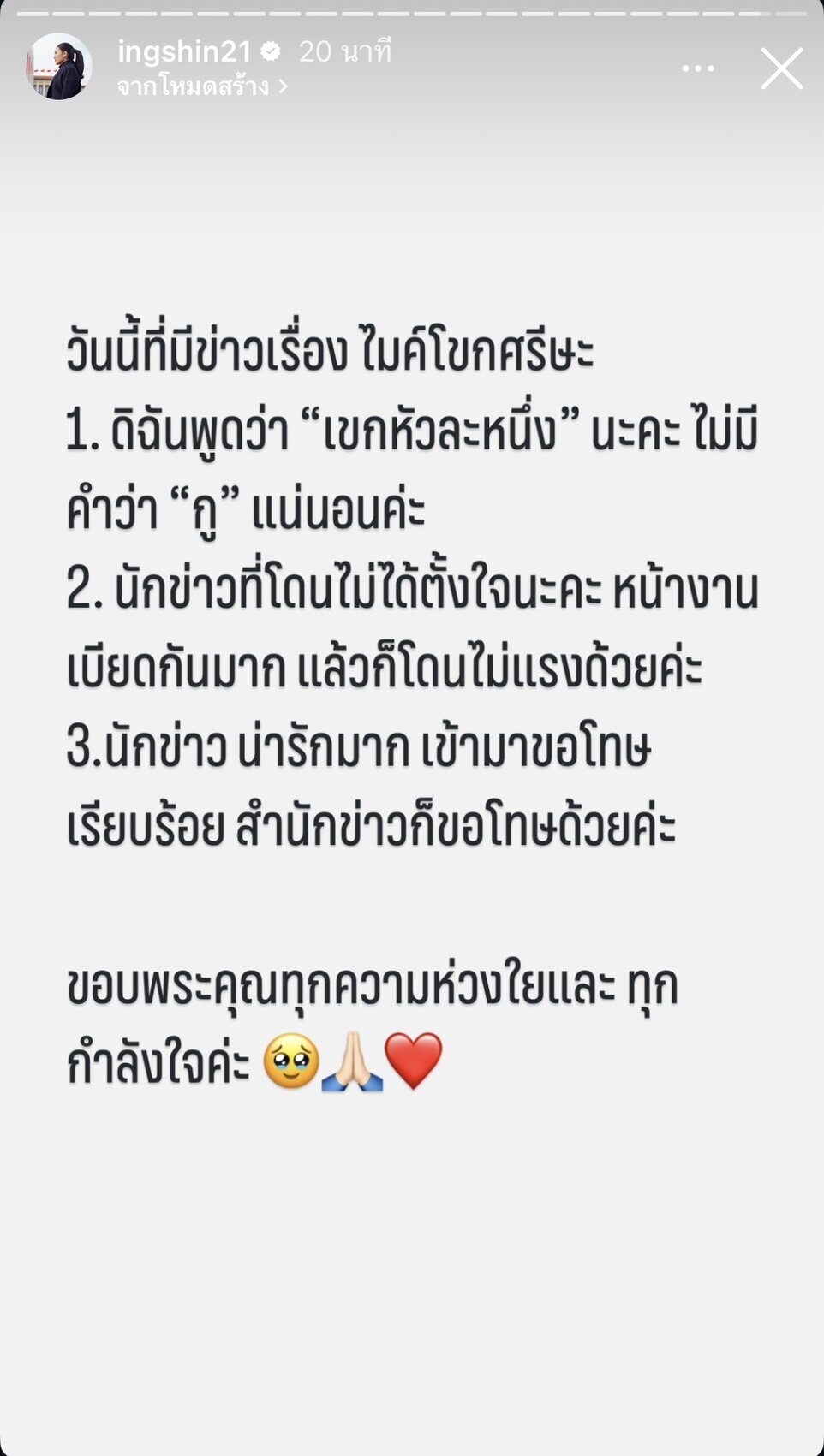เมื่อเวลา 19.09 น. วันที่ 20 มิ.ย. 2568 น.ส.แพทองธาร ชินวัตร นายกรัฐมนตรี โพสต์ข้อความผ่านสตอรี่อินสตาแกรม ชี้แจงกรณีถูกไมโครโฟนของนักข่าวโดนศีรษะ ระหว่างการลงพื้นที่ให้กำลังใจทหารที่ จ.อุบลราชธานี