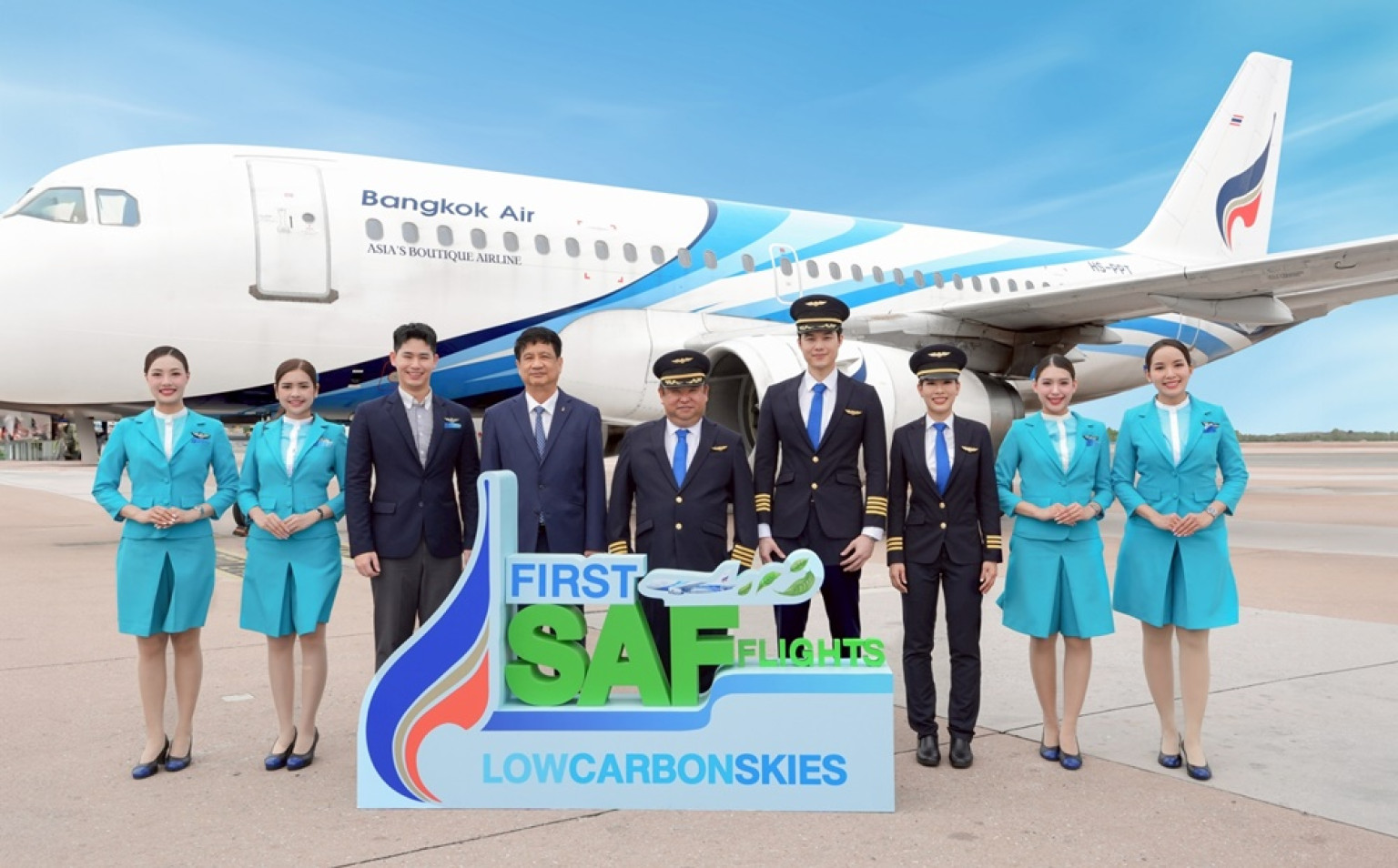 เที่ยวบินรักษ์โลก…สายการบินบางกอกแอร์เวย์ส นำโดยกัปตันพุฒิพงศ์ ปราสาททองโอสถ และเดชิศร์ เจริญวงศ์ เปิดตัวการนำเชื้อเพลิงอากาศยานแบบยั่งยืนมาใช้ในเที่ยวบินเชิงพาณิชย์อย่างเป็นทางการ ใน 4 เส้นทาง จากกรุงเทพ (สุวรรณภูมิ) สู่จุดหมายปลายทางระหว่าง พนมเปญ เสียมเรียบ หลวงพระบาง และ มัลดีฟส์ ภายใต้แคมเปญ Low Carbon Skies by Bangkok Airways นับเป็นเป็นก้าวสำคัญสู่อนาคตการบินที่เป็นมิตรกับสิ่งแวดล้อม ที่ท่าอากาศยานนานาชาติสุวรรณภูมิ