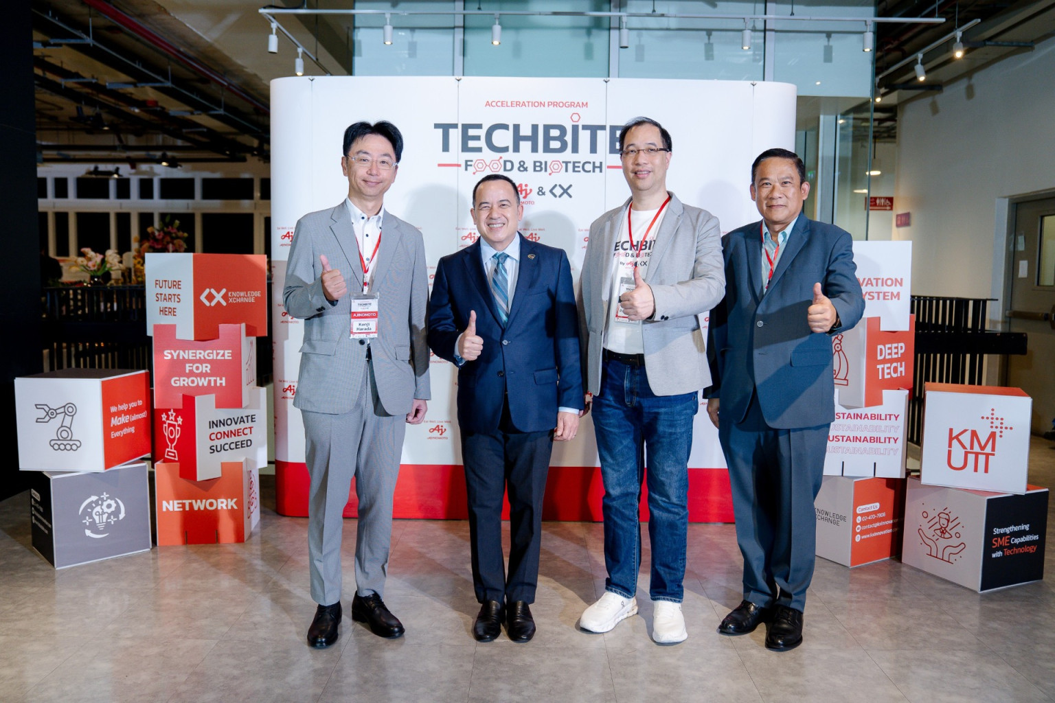 ขับเคลื่อน…อายิโนะโมะโต๊ะ (ประเทศไทย) นำโดย เค็นจิ ฮะระดะ ร่วมมือกับ ศูนย์บริหารจัดการเทคโนโลยีและนวัตกรรม มหาวิทยาลัยเทคโนโลยีพระจอมเกล้าธนบุรี โดยดร.ภัทรชาติ โกมลกิติ ร่วมเปิดตัวโครงการ TECHBITE Food & Biotech Accelerator Program เร่งเสริมศักยภาพสตาร์ทอัพด้านเทคโนโลยีอาหาร ไบโอเทค และสุขภาพ ผลักดันไทยจาก “ครัวของโลก” สู่การเป็น “ผู้นำด้านนวัตกรรมอาหารเชิงลึก” ที่ อาคาร KX – Knowledge Xchange