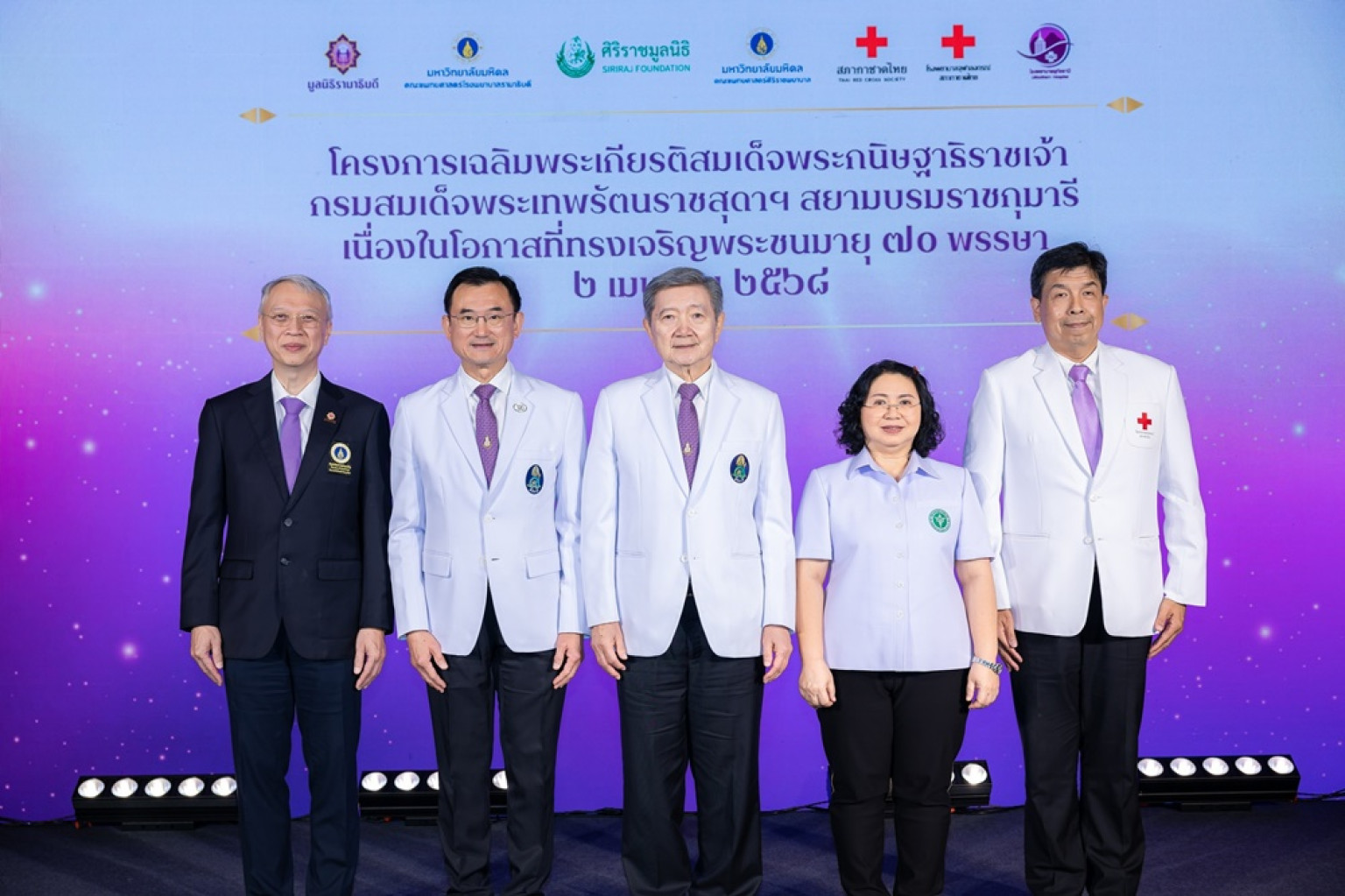 รวมพลัง…คณะแพทยศาสตร์ศิริราชพยาบาล โดยศิริราชมูลนิธิ คณะแพทยศาสตร์โรงพยาบาลรามาธิบดี โดยมูลนิธิรามาธิบดีฯ และ โรงพยาบาลจุฬาลงกรณ์ สภากาชาดไทย รวมพลังจัด “โครงการเฉลิมพระเกียรติสมเด็จพระกนิษฐาธิราชเจ้า กรมสมเด็จพระเทพรัตนราชสุดาฯ สยามบรมราชกุมารี เนื่องในโอกาสที่ทรงเจริญพระชนมายุ 70 พรรษา 2 เมษายน 2568” โดยมี ศ.คลินิกเกียรติคุณ นพ.ปิยะสกล สกลสัตยาทร ศ.นพ.อภิชาติ อัศวมงคลกุล ศ.คลินิก นพ.อาทิตย์ อังกานนท์ รศ.นพ.ฉันชาย สิทธิพันธุ์ และ พญ.ชนิญญา พัฒนศักดิ์ภิญโญ ร่วมแถลงข่าว ที่คณะแพทยศาสตร์ศิริราชพยาบาล มหาวิทยาลัยมหิดล