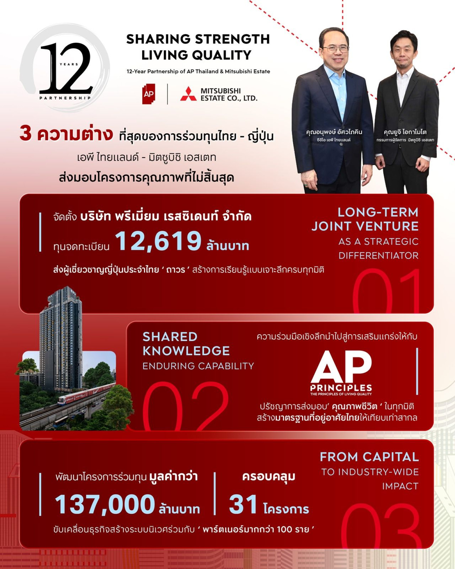 บมจ. เอพี ไทยแลนด์-บมจ.มิตซูบิชิ เอสเตท 2 องค์กรชั้นนำไทย-ญี่ปุ่น เดินหน้าความสำเร็จ 12 ปี ความร่วมมือ ที่สุดของพันธมิตรหนึ่งเดียวที่มั่นคงและยาวนานในอุตสาหกรรม พร้อมยังคงเจตจำนงเหมือนวันแรกในการร่วมสร้างคุณค่าใหม่ๆ ให้กับที่อยู่อาศัยไทย เพื่อส่งมอบชีวิตดีๆ ที่เลือกเองได้ 12 ปีบทพิสูจน์ของ ‘ความไว้ใจ’ และ ‘วิสัยทัศน์’ ที่พาให้ก้าวไกลกว่าคำว่า ‘ร่วมทุน’ ถอดรหัสความต่างเพียงหนึ่งเดียวกับบทเรียนธุรกิจที่มากกว่าเม็ดเงินลงทุน แต่คือจิกซอว์ความสำเร็จ สู่การสร้างที่อยู่อาศัยคุณภาพ