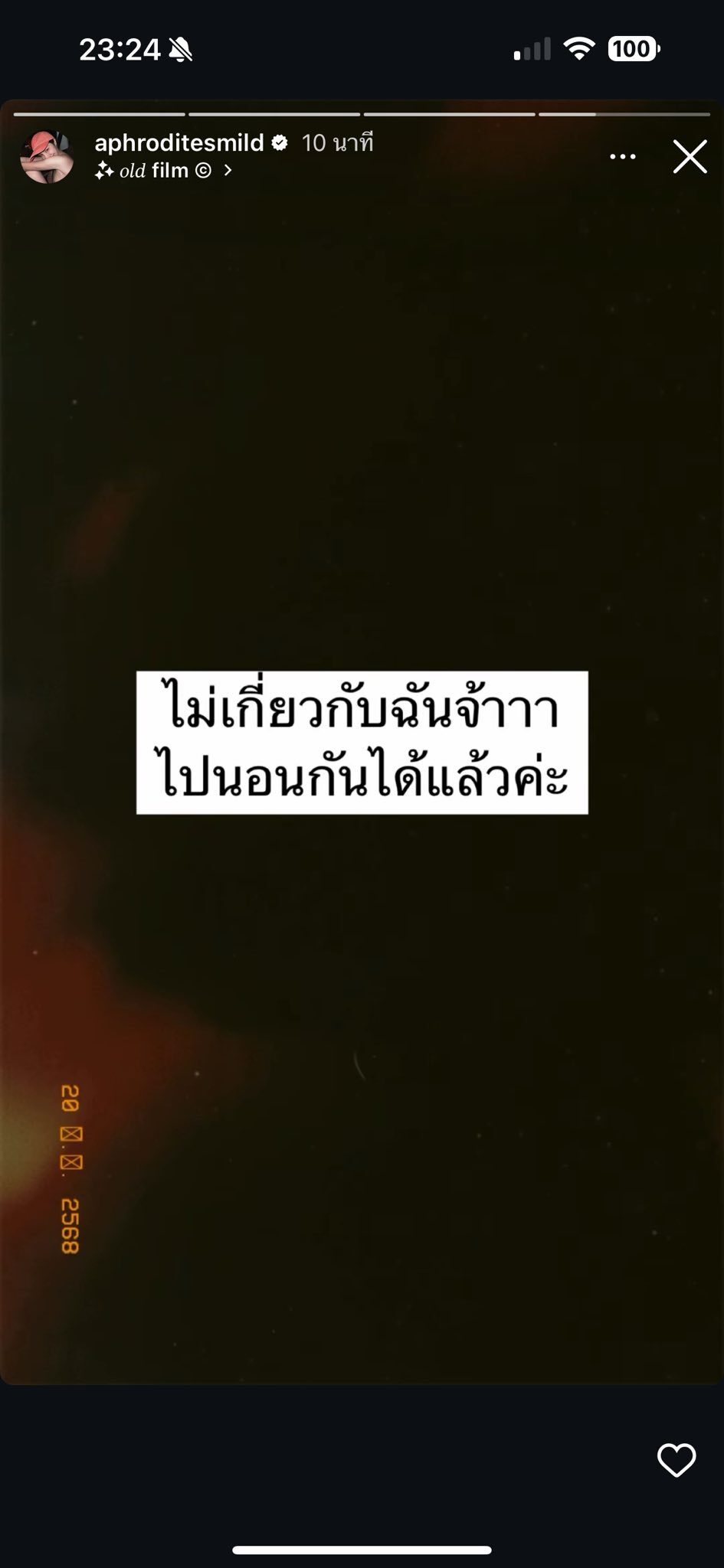 ล่าสุด มาย โพสต์ ไอจีสตอรี่ว่า ไม่เกี่ยวกับฉันจ้าา "ไปนอนกันได้แล้วค่ะ" ทั้งนี้ มาย เองเคยออกมาให้สัมภาษณ์ผ่านรายการดัง โดยยืนยัน ไม่ได้เป็นมือที่สาม ทำ โต้ง ทูพี เลิกนางเอก ยอมรับมีการพูดคุยกันจริง แต่ฝ่ายชายเป็นคนทักมาก่อน