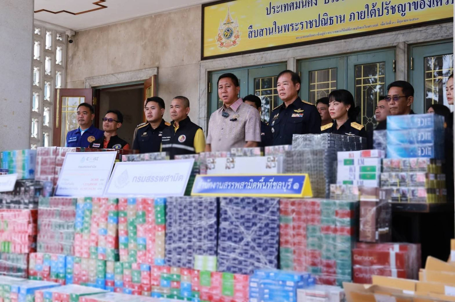 วันที่ 19 มิถุนายน 2568 เวลา 10.00 น.ผู้สื่อข่าวรายงาน ว่า ณ บริเวณด้านหน้าศาลากลางจังหวัดชลบุรี นายธวัชชัย ศรีทอง ผู้ว่าราชการจังหวัดชลบุรี พร้อมด้วยหัวหน้าส่วนราชการที่เกี่ยวข้อง ร่วมแถลงข่าวผลการตรวจยึดบุหรี่ผิดกฎหมายรายใหญ่ในพื้นที่จังหวัดชลบุรี ซึ่งเป็นไปตามนโยบายของกรมสรรพสามิต “Zero Tolerance : สินค้าหลีกเลี่ยงภาษีสรรพสามิตต้องเป็นศูนย์” ที่มุ่งเน้นการป้องกันและปราบปรามการลักลอบนำเข้าสินค้าโดยไม่ได้เสียภาษีสรรพสามิต