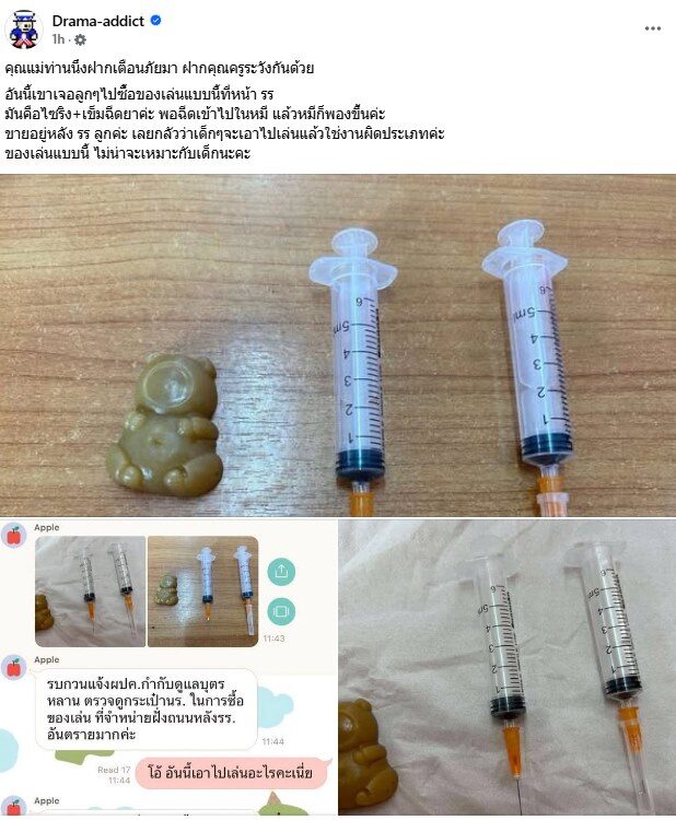 เพจ Drama-addictโพสต์แจ้งเตือนของเล่นที่นำมาขายให้นักเรียน ความว่า คุณแม่ท่านหนึ่งฝากเตือนภัยมา ฝากคุณครูระวังกันด้วย อันนี้เขาเจอลูกๆไปซื้อของเล่นแบบนี้ที่โรงเรียน มันคือไซริงค์+เข็มฉีดยา พอฉีดเข้าไปในหมี แล้วหมีก็พองขึ้นค่ะ