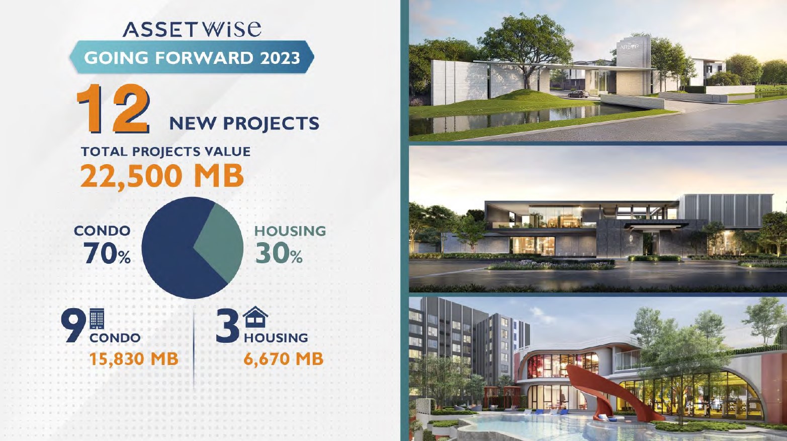 “กรมเชษฐ์ วิพันธ์พงษ์” ประธานเจ้าหน้าที่บริหารบริษัท แอสเซทไวส์ จำกัด (มหาชน) เปิดแผนธุรกิจปี 2566 เตรียมเปิดตัว 12 โครงการ มูลค่ารวม 22,500 ล้านบาท มากกว่าปีก่อนกว่าเท่าตัวและตั้งเป้าพรีเซล 15,000 ล้านบาท เป้ารับรู้รายได้ 7,200 ล้านบาท