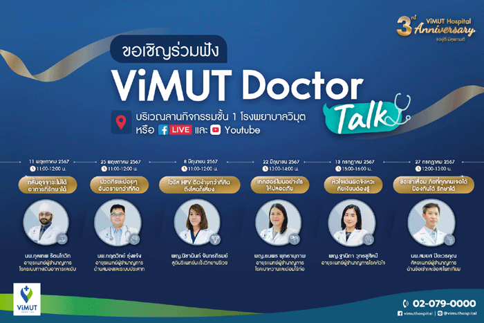ติดตามข่าวสารกิจกรรมและโปรโมชั่ นดี ๆ จากโรงพยาบาลวิมุตได้ที่เว็ บไซต์ www.vimut.com เฟซบุ๊ก : Vimut Hospital อินสตาแกรม : vimut_hospital ไลน์ : @vimuthospital หรือติดต่อที่ โทร. 02-079-0000