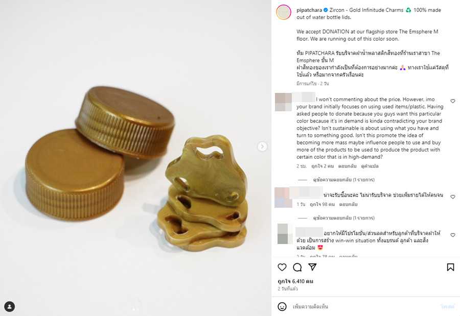 อ่านข่าวต้นฉบับได้ที่ : แบรนด์ PIPATCHARA รับบริจาคฝาน้ำพลาสติก คนติงทำไมไม่รับซื้อ?