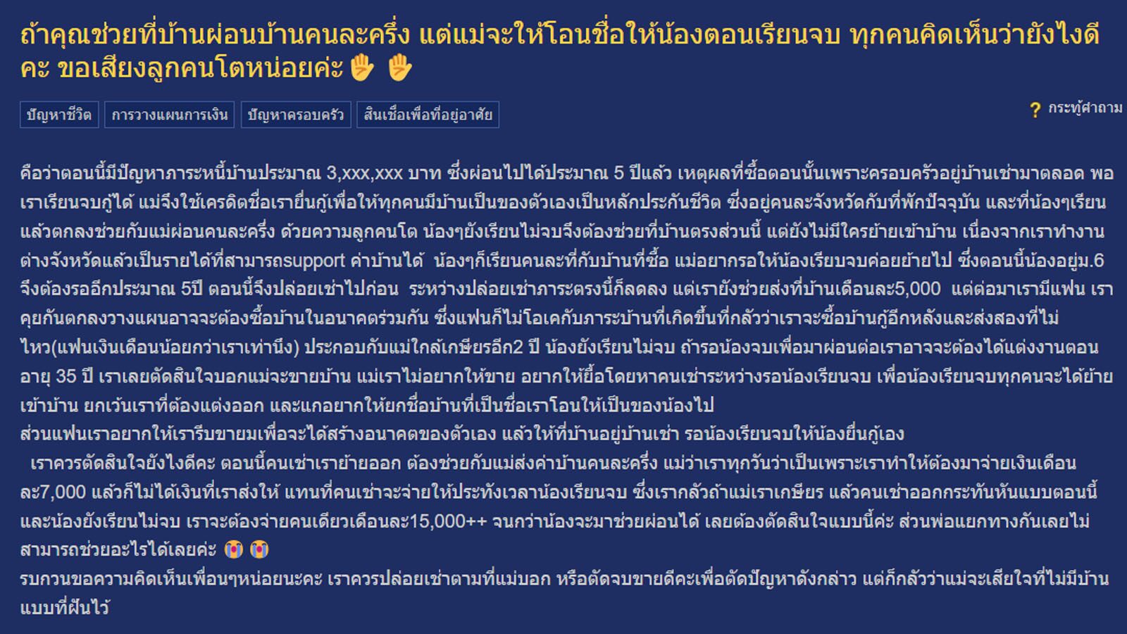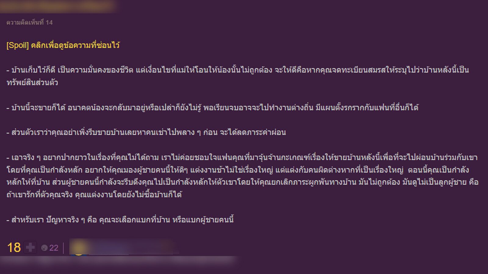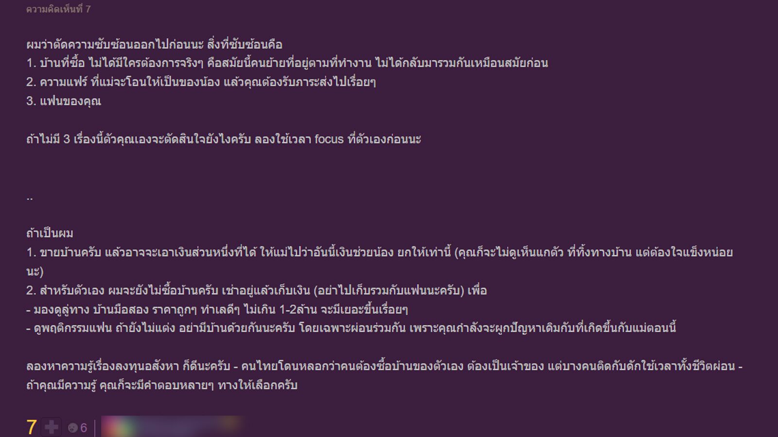 ต่อมาเธอมีแฟนและได้วางแผนว่าอาจต้องกู้ซื้อบ้านร่วมกัน แฟนจึงไม่ค่อยโอเคกับภาระค่าบ้านของเธอ เพราะกลัวว่าเธอจะผ่อนบ้านอีกหลังไม่ไหว (แฟนเงินเดือนน้อยกว่าเจ้าของกระทู้หนึ่งเท่า) เขาอยากให้เธอรีบขายบ้านเพื่อที่จะได้สร้างอนาคตของตัวเอง ด้านน้องๆ ก็รอเรียนจบแล้วให้ยื่นกู้ซื้อบ้านเอง นอกจากนี้แม่ใกล้จะเกษียณแล้วเหลืออีก 2 ปี หากให้เธอรอน้องเรียนจบเพื่อมาช่วยผ่อนบ้านต่อ เธออาจจะได้แต่งงานตอนอายุ 35 ปี เธอจึงบอกแม่ว่า "จะขายบ้าน"