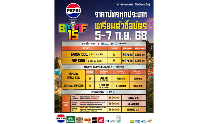 • เปิดจำหน่ายบัตร VIP COW ราคา 4,000 บาท (จากปกติ 5,000 บาท) ตั้งแต่วันที่ 5 กันยายน 2568 เวลา 08:00 น. เป็นต้นไป ที่ Counter Service All Ticket ในร้าน 7- Eleven ทุกสาขาทั่วประเทศ / เว็บไซต์ www.allticket.com/event/BigMountainMusicFestival15 / เว็บไซต์ https://ticketier.events/Hy4mb / แอปพลิเคชัน TICKETIER และบัตรผ่อน VIP COW (ชำระ 3 งวด) ที่เว็บไซต์ https://ticketier.events/uSnab / แอปพลิเคชัน TICKETIER