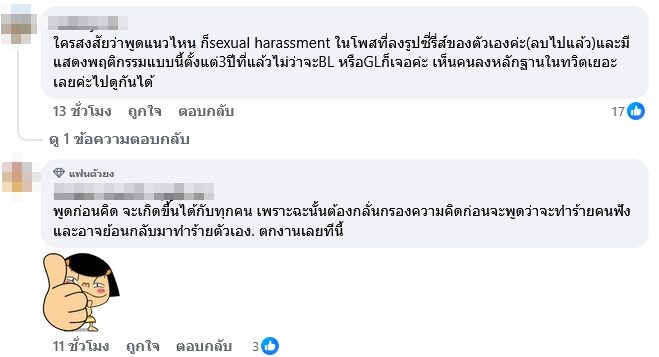 -ใครสงสัยว่าพูดแนวไหน ก็sexual harassment ในโพสต์ที่ลงรูปซีรีส์ของตัวเองค่ะ(ลบไปแล้ว)และมีแสดงพฤติกรรมแบบนี้ตั้งแต่3ปีที่แล้วไม่ว่าจะBL หรือGLก็เจอค่ะ เห็นคนลงหลักฐานในทวิตเยอะเลยค่ะไปดูกันได้ เป็นต้น