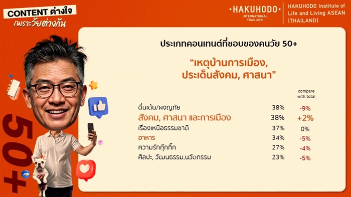 คนกลุ่มนี้อายุ 40-49 ปี มักให้ความสำคัญกับเนื้อหาที่สร้างความผ่อนคลายและเติมเต็มความสุขส่วนตัว เช่น อาหารและการทำอาหาร (+3%) และเรื่องราวลี้ลับ (+1%) และสวนทางกับคนในช่วงวัย 20+ เนื่องจากความสนใจในเนื้อหาโรแมนติกลดลง (-7%)