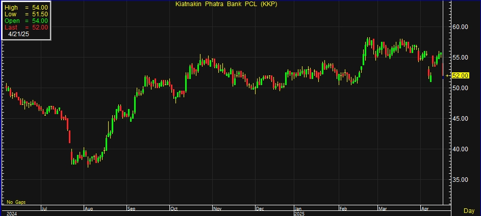 ผู้สื่อข่าวรายงานว่า วันนี้ (21 เม.ย.68) ราคาหุ้น ธนาคารเกียรตินาคินภัทร จำกัด (มหาชน) หรือ KKP ณ เวลา 10:29 น. อยู่ที่ระดับ 52 บาท ลบ 3.75 บาท หรือ 6.73% สูงสุดที่ระดับ 54 บาท ต่ำสุดที่ระดับ 51.50 บาท ด้วยมูลค่าการซื้อขาย 171.17 ล้านบาท