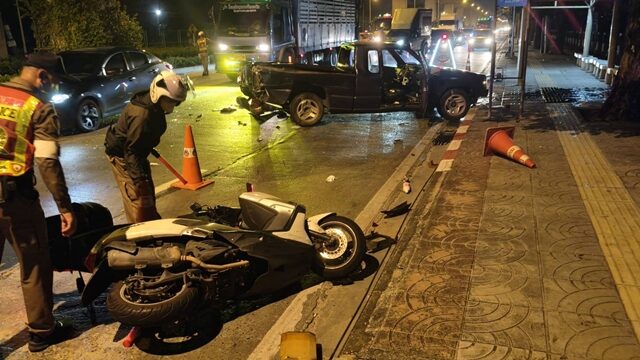 ที่เกิดเหตุเป็นถนน 4 เลน ในช่องทางขวาสุดพบรถบรรทุก 6 ล้อ ยี่ห้ออีซูซุ ทะเบียน กทม. สภาพด้านหน้ารถซ้ายมีรอยชนอย่างรุนแรงพังยับ ประตูฝั่งซ้ายหลุด ห่างออกไปพบรถกระบะ ยี่ห้อมิตซูบิชิ ทะเบียน กทม. สภาพถูกชนท้ายกระบะอย่างแรงพังเสียหาย จอดอยู่ในช่องทางซ้ายสุด