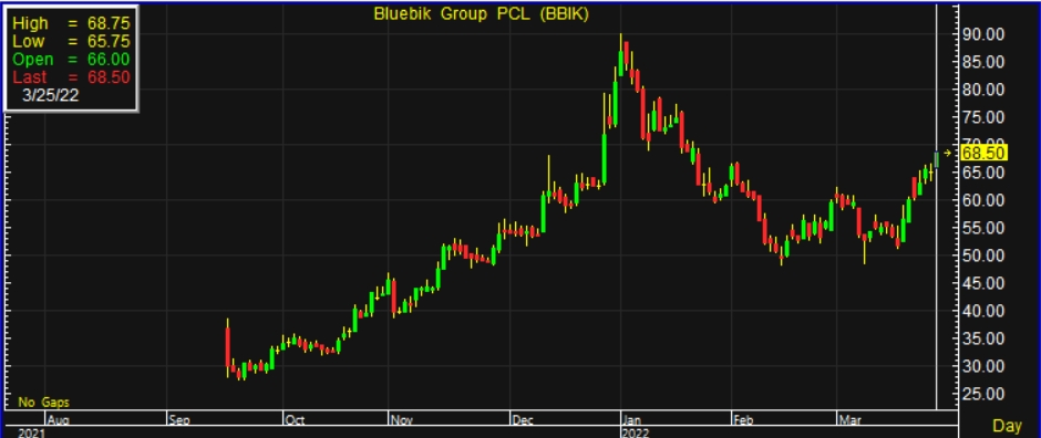 ผู้สื่อข่าวรายงานว่า ราคาหุ้น บริษัท บลูบิค กรุ๊ป จำกัด (มหาชน) หรือ BBIK ณ เวลา 10:28 น. อยู่ที่ระดับ 68.50 บาท บวก 3.50 บาท หรือ 5.38% สูงสุดที่ระดับ 68.75 บาท ต่ำสุดที่ระดับ 65.75 บาท ด้วยมูลค่าการซื้อขาย 81.98 ล้านบาท