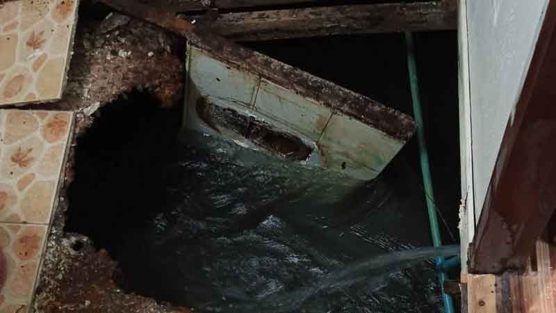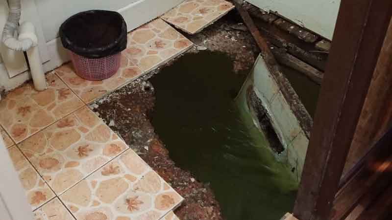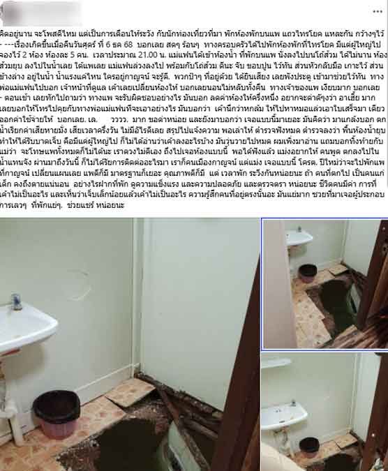 หนุ่มเตือนภัย แพที่พัก พื้นห้องน้ำพัง แม่แฟนร่วงลงไปใต้น้ำพร้อมโถส้วม หวิดเอาชีวิตไม่รอด