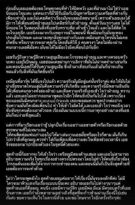 “เอย เลยไม่อยากออกมาพูดอะไรอีก ให้คนยิ่งปั่นกัน เพราะเรื่องของ เอย มีคนกลาง mutual friends เยอะพอสมควร พูดปากต่อปาก ข้อความมันก็คงผิดเพี้ยนไป ทำให้เข้าใจผิดได้ เอย เข้าใจว่าพอถึงเวลาคับขัน ทุกคนต้องเอาตัวรอด เรื่องมาแบบนี้การเอาทุกอย่างมาลงที่เอยมันก็จบง่ายที่สุด ”