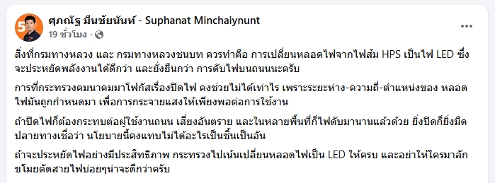 โดยโพสต์ดังกล่าว ระบุข้อความว่า “สิ่งที่กรมทางหลวง และ กรมทางหลวงชนบท ควรทำคือ การเปลี่ยนหลอดไฟจากไฟส้ม HPS เป็นไฟ LED ซึ่งจะประหยัดพลังงานได้ดีกว่า และยั่งยืนกว่า การดับไฟบนถนนนะครับ