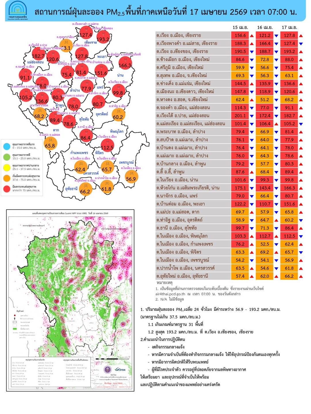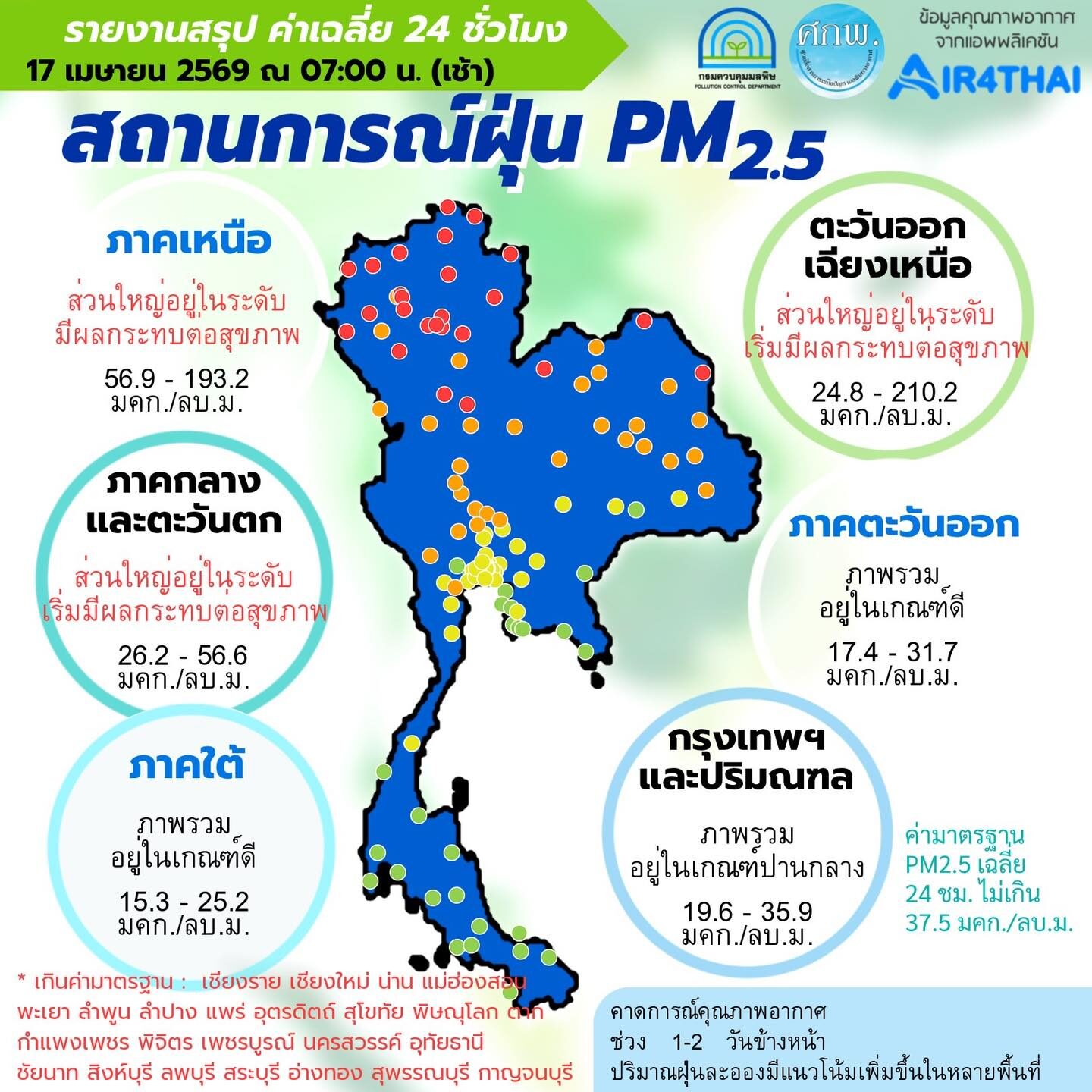 วันที่ 17 เม.ย.2569 ศูนย์สื่อสารการแก้ไขปัญหามลพิษทางอากาศ รายงานการติดตามตรวจสอบคุณภาพอากาศ ประจำวันที่ 17 เมษายน 2569 ณ 07:00 น สรุปดังนี้