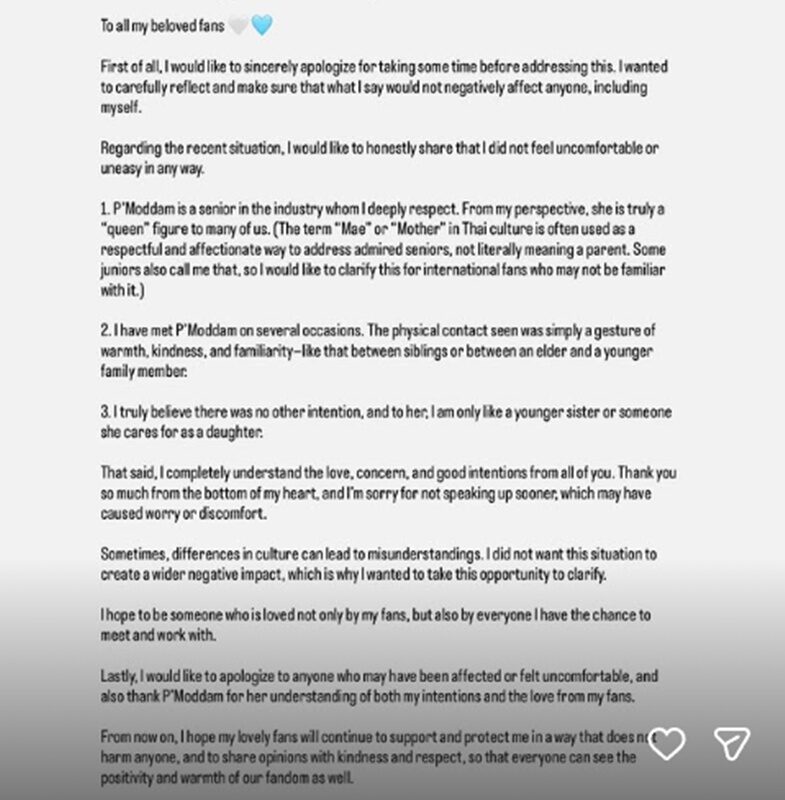 “บางครั้งความแตกต่างทางวัฒนธรรมอาจทำให้เกิดความเข้าใจที่คลาดเคลื่อนได้ และน้ำตาลไม่อยากให้เรื่องนี้ส่งผลกระทบในวงกว้าง จึงอยากออกมาสื่อสารให้ชัดเจนน้ำตาลอยากเป็นที่รักของทุกคน ไม่ใช่แค่แฟนๆ แต่รวมถึงทุกคนที่น้ำตาลได้พบเจอและมีโอกาสร่วมงานด้วย”