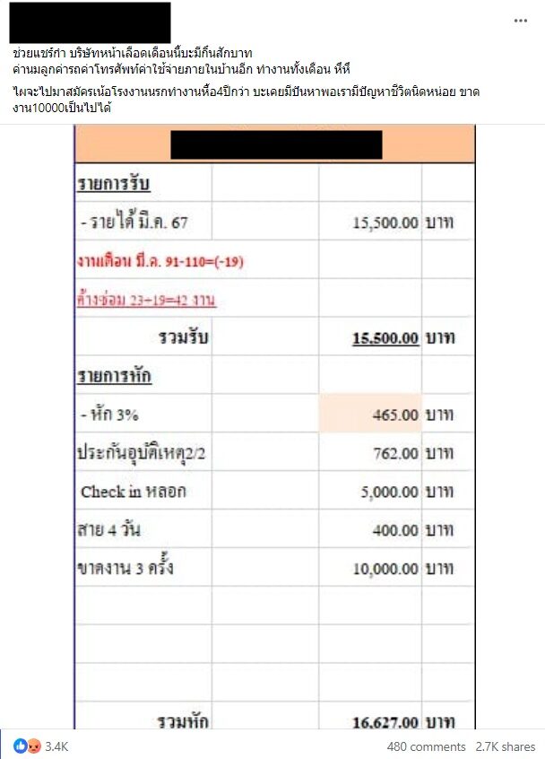 กลายเป็นเรื่องที่กำลังเป็นที่วิพากษ์วิจารณ์ในโลกออนไลน์ เมื่อเพจ อีซ้อขยี้ข่าว โพสต์ภาพพร้อมข้อความ ผู้ใช้แรงงานรายหนึ่ง โดนบริษัทหักเงิน 16,000 บาท โดยที่เจ้าตัวมีเงินเดือนอยู่ที่ 15,000 บาท พร้อมเขียนข้อความ ระบุว่า