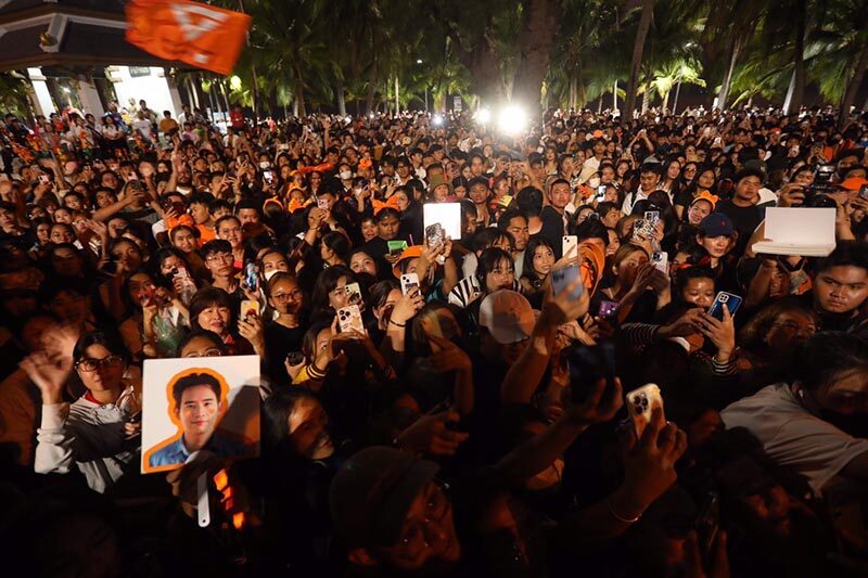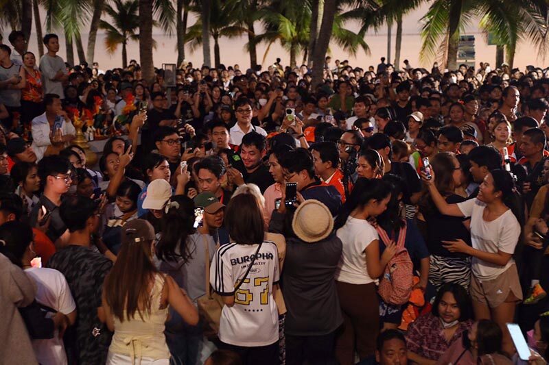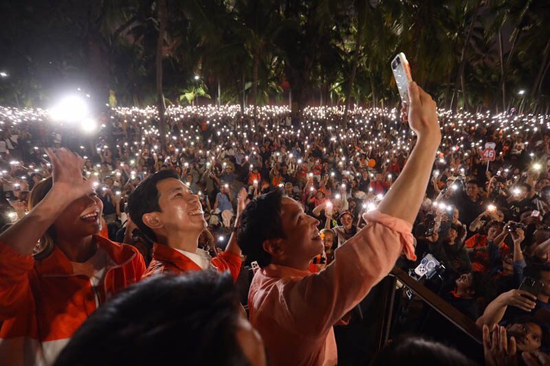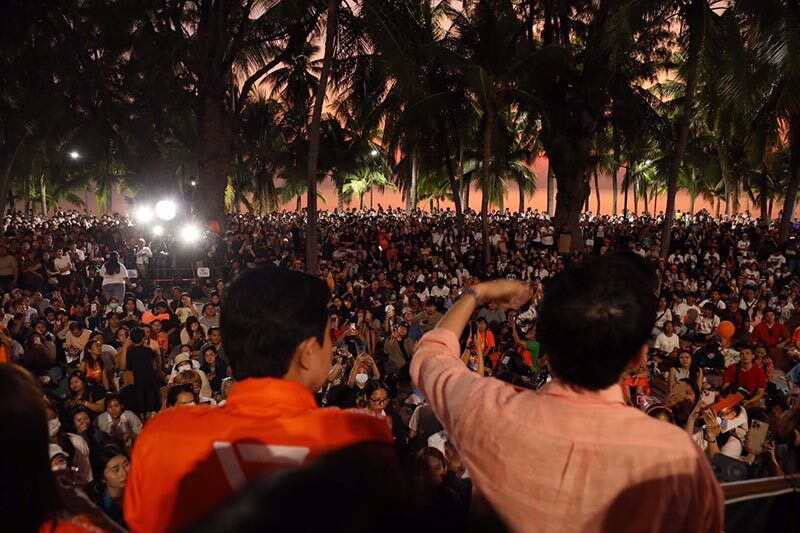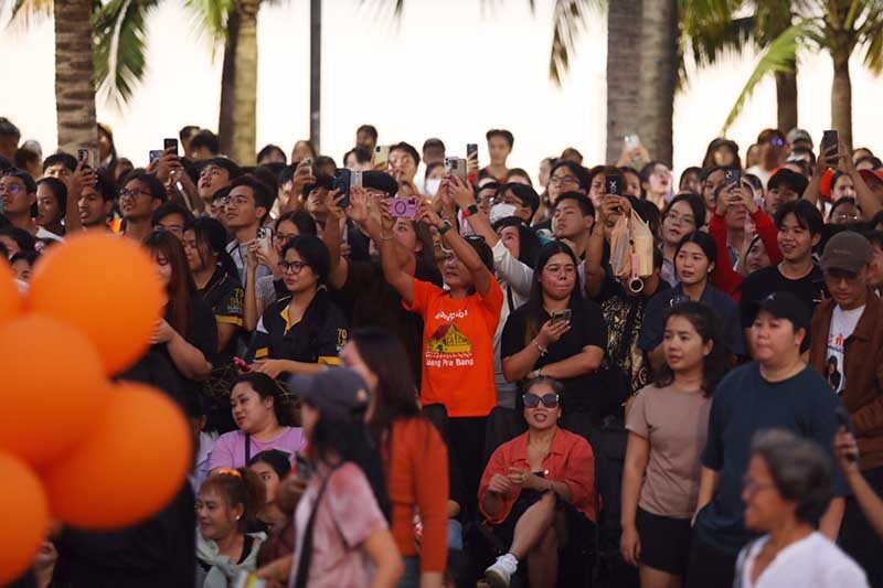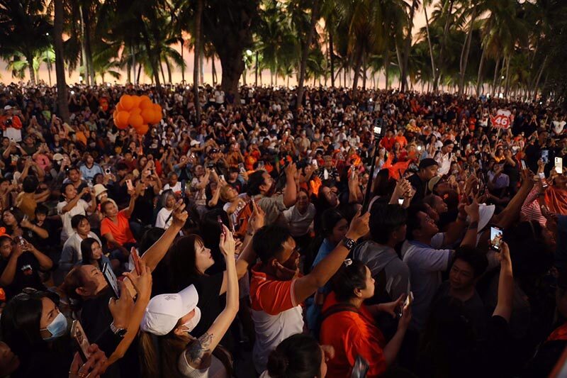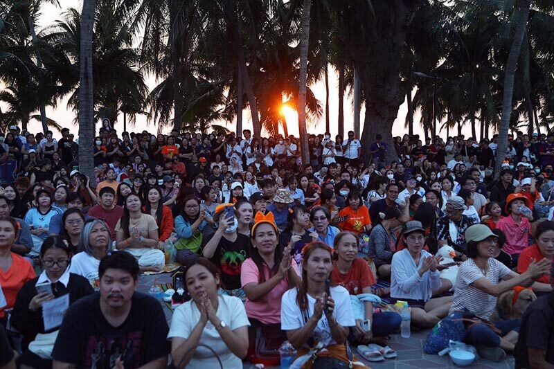 จากน้้น นายพิธา และผู้สมัคร สส.พรรคประชาชน จ.ชลบุรี ร่วมกันถ่ายภาพทะเลดาวกับชาวชลบุรีที่มาฟังการปราศรัยที่มากันอย่างเนืองแน่นริมชายหาดบางแสน