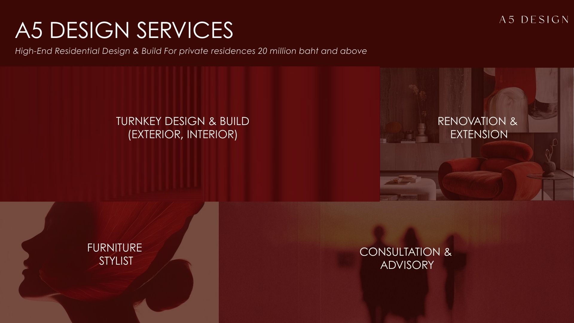 ด้านนายณัฐพล ผลอเนก ผู้อำนวยการฝ่ายธุรกิจ บริษัท เอไฟว์ ดีไซน์ จำกัด (A5 Design) กล่าวว่า บริษัทฯ ให้บริการในรูปแบบ Conscious Design Service แบบครบวงจร ด้วยประสบการณ์ในตลาดลักชัวรีมากกว่า 10 ปี โดยมี 4 บริการหลัก ได้แก่ 1. Turn Key Design and Build 2. Furniture Stylist 3. Renovate and Extension และ 4. Design Consultant