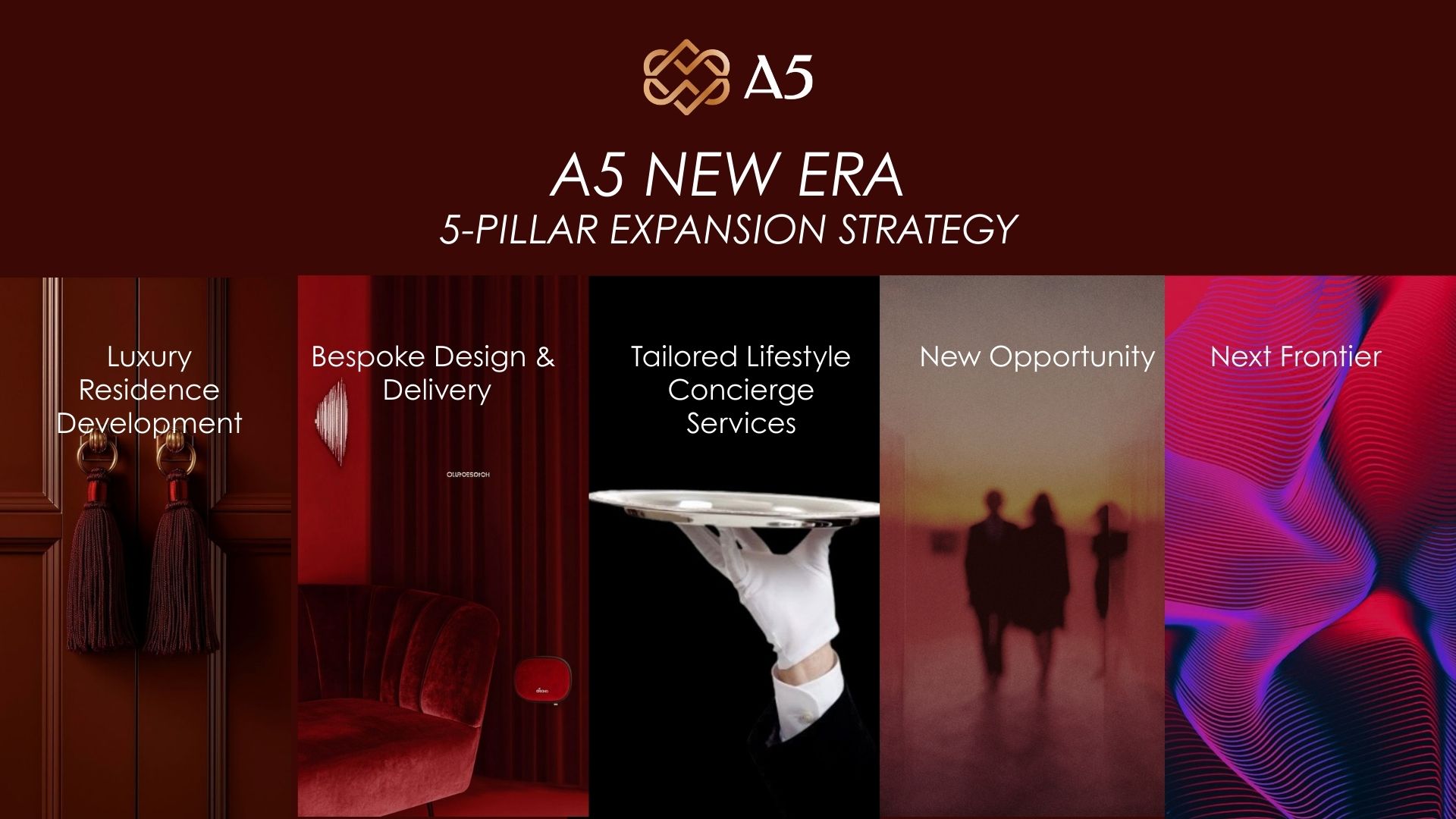 ด้วยเหตุนี้ A5 จึงได้กำหนดกลยุทธ์ "5 เสาหลัก" เพื่อขับเคลื่อนองค์กรสู่ความยั่งยืนในระดับ 100 ปี ประกอบด้วย 1.การพัฒนาที่อยู่อาศัย (Residential) ซึ่งเป็นเสาหลักเดิม 2.บริษัท เอไฟว์ ดีไซน์ จำกัด (A5 Design) 3.บริษัท อัพเพอร์ คลาส โซลูชัน จำกัด (Upper Class Solution) 4.New Opportunity การแบ่งงบลงทุนจากการซื้อที่ดิน 2-3 แปลงต่อปี มาลงทุน 1 แปลงในธุรกิจใหม่ๆ เพื่อสร้างรายได้เพิ่ม และ 5.บริษัทด้านเทคโนโลยี (Tech Company) ซึ่งจะมีการเปิดตัวในระยะถัดไป