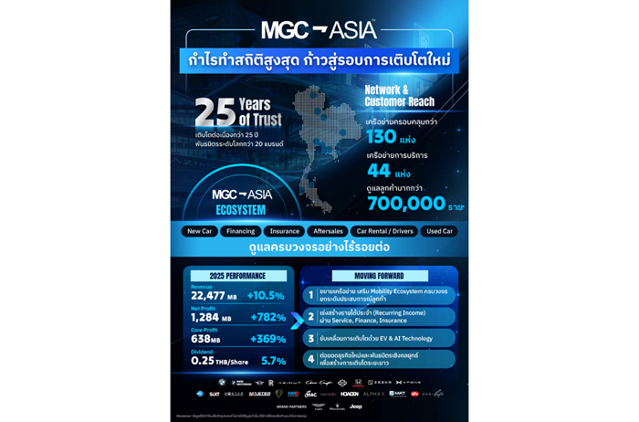 บริษัท มิลเลนเนียม กรุ๊ป คอร์ปอเรชั่น (เอเชีย) จำกัด (มหาชน) หรือ MGC-ASIA แถลงผลการดำเนินงานปี 2568 เติบโตโดดเด่น ทำสถิติกำไรสูงสุดใหม่ สะท้อนความแข็งแกร่งของโครงสร้างธุรกิจในระบบนิเวศ Mobility Ecosystem เชื่อมโยงตั้งแต่การจำหน่ายยานยนต์พรีเมียม รถยนต์ไฟฟ้า ธุรกิจการเงิน ประกันภัย บริการหลังการขาย และรถเช่า ช่วยสร้างรายได้ประจำที่เพิ่มขึ้นอย่างต่อเนื่อง ส่งผลให้บริษัทมีฐานกำไรที่แข็งแรงและเสถียรภาพสูงทั้งยอดขายยานยนต์พรีเมียม การเติบโตของตลาดรถยนต์ไฟฟ้า รายได้ประจำจากบริการ (Recurring Income) การฟื้นตัวของธุรกิจการเงินและประกันภัย ส่งผลให้อัตรากำไรและกระแสเงินสดของกลุ่มปรับตัวดีขึ้นอย่างมีนัยสำคัญ ยึดหลักการมีลูกค้า เป็นศูนย์กลาง โดยปีนี้เป็นการเริ่มบันทึกหน้าใหม่ เพื่อก้าวเข้าสู่การดำเนินธุรกิจยุคอนาคต