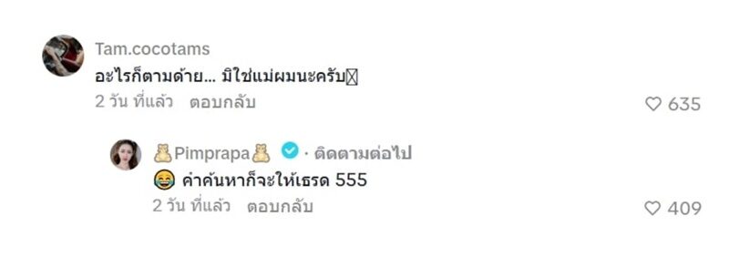 “พิมยังแซวเขาอยู่เลยว่า ไม่อยากเป็นคู่รักดังเหรอ คิดว่าที่เขาเข้าไปเขียนคงไม่ได้ถึงขนาดชี้แจงหรอก คือเขาก็เล่นติ๊กต็อกอยู่แล้ว เวลาเห็นอะไรที่มันไม่จริงและเห็นคำค้นหาเป็นชื่อเรากับชื่อเขา เขาก็รู้สึกว่าก็แค่เมนต์ไปให้มันจบๆ เพื่อที่จะได้ไม่ต้องเดากันให้มันเข้าใจผิด”