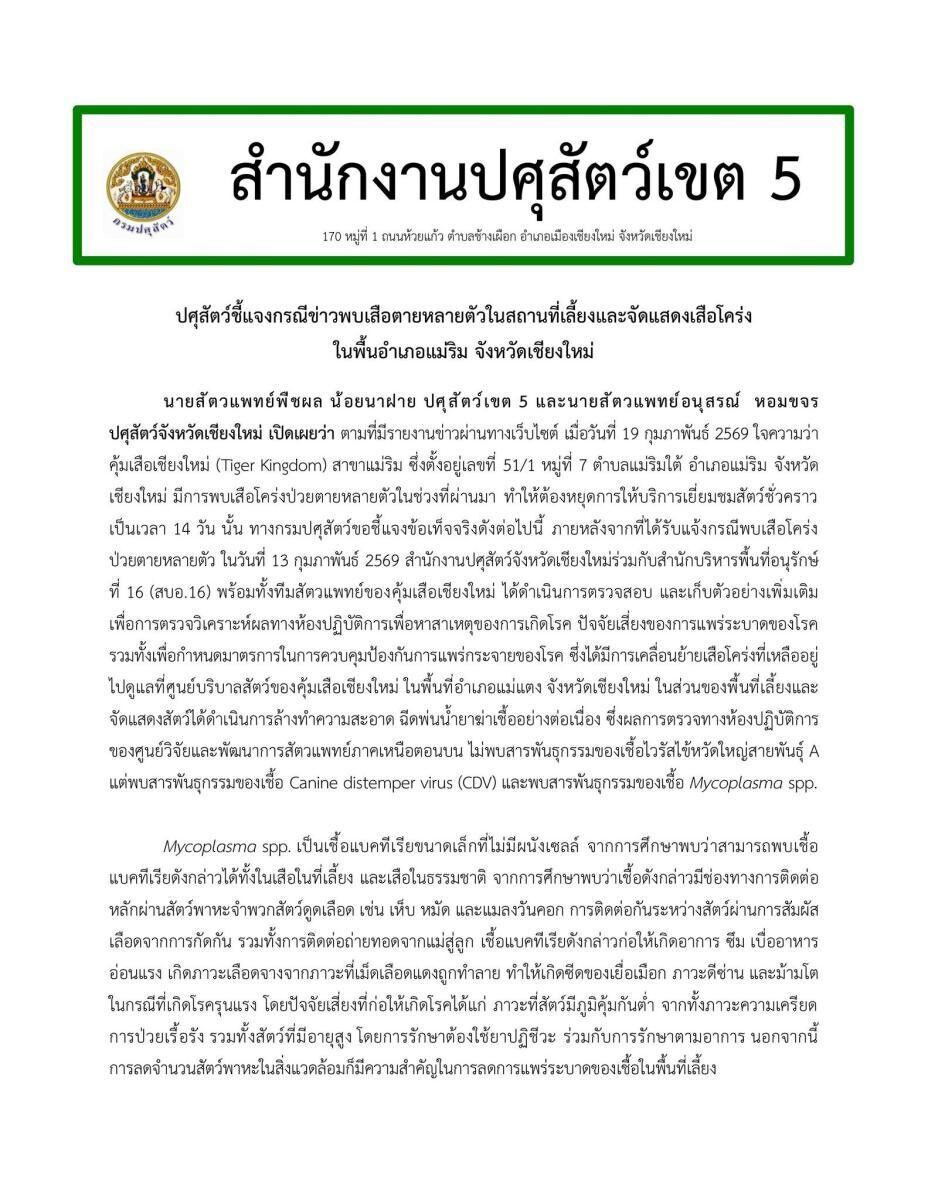 - 18 ก.พ. 2569 คุ้มเสือแม่ริมพบเสือโคร่งป่วย 3 ตัว และตายเพิ่ม 1 ตัว เหลือ 29 ตัว, คุ้มเสือแม่แตงรับเสือโคร่งเพิ่ม 29 ตัว ไม่พบการตายเพิ่ม คงเหลือ 95 ตัว