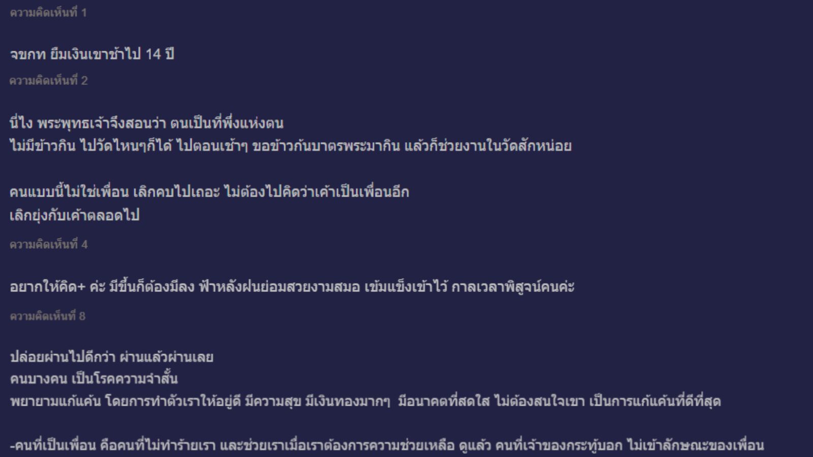สำหรับความคิดเห็นส่วนใหญ่ของชาวเน็ตแนะนำว่า หากเรื่องนี้ไม่มีเหตุผลอื่นแอบแฝง หรือเบื้องลึกเบื้องหลังมากกว่านั้น เจ้าของกระทู้กำลังจะได้เห็นธาตุแท้ของคน เพราะคำนิยามของคำว่าเพื่อนคือ คนที่ไม่ทำร้ายและคอยช่วยเหลือเมื่อยามลำบาก